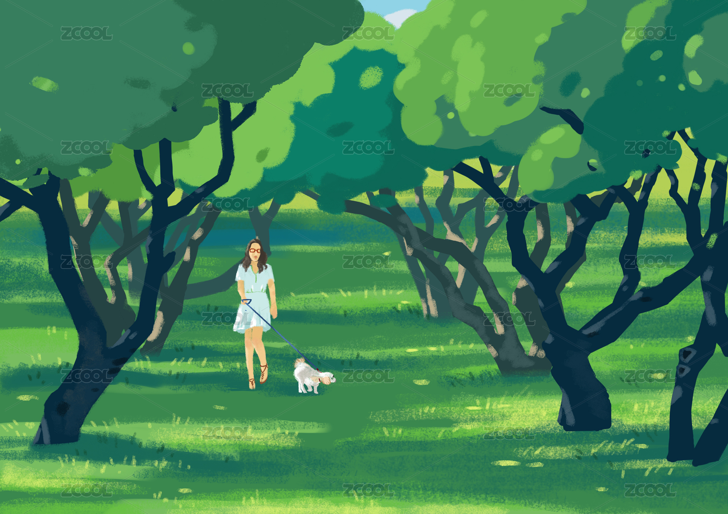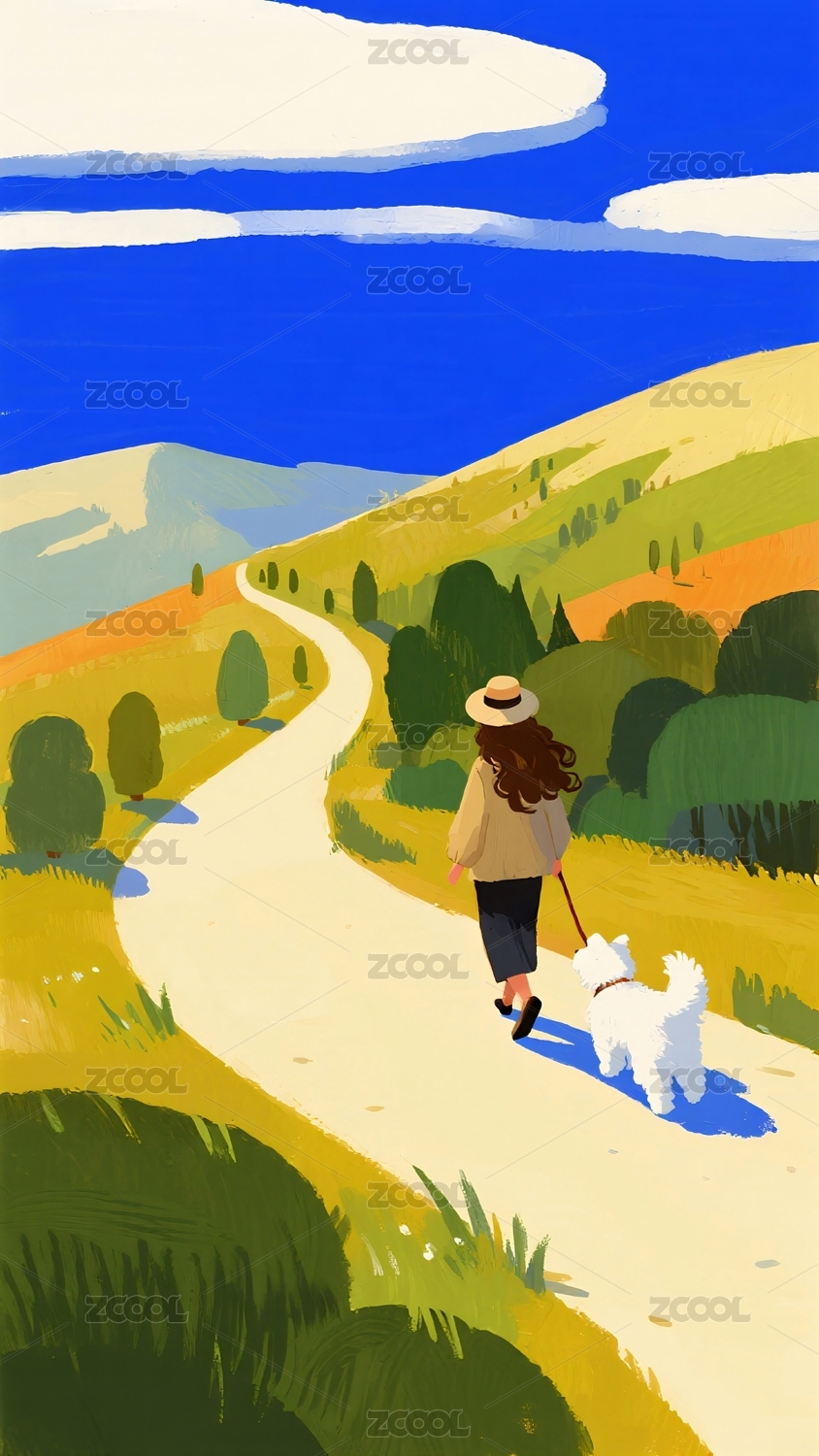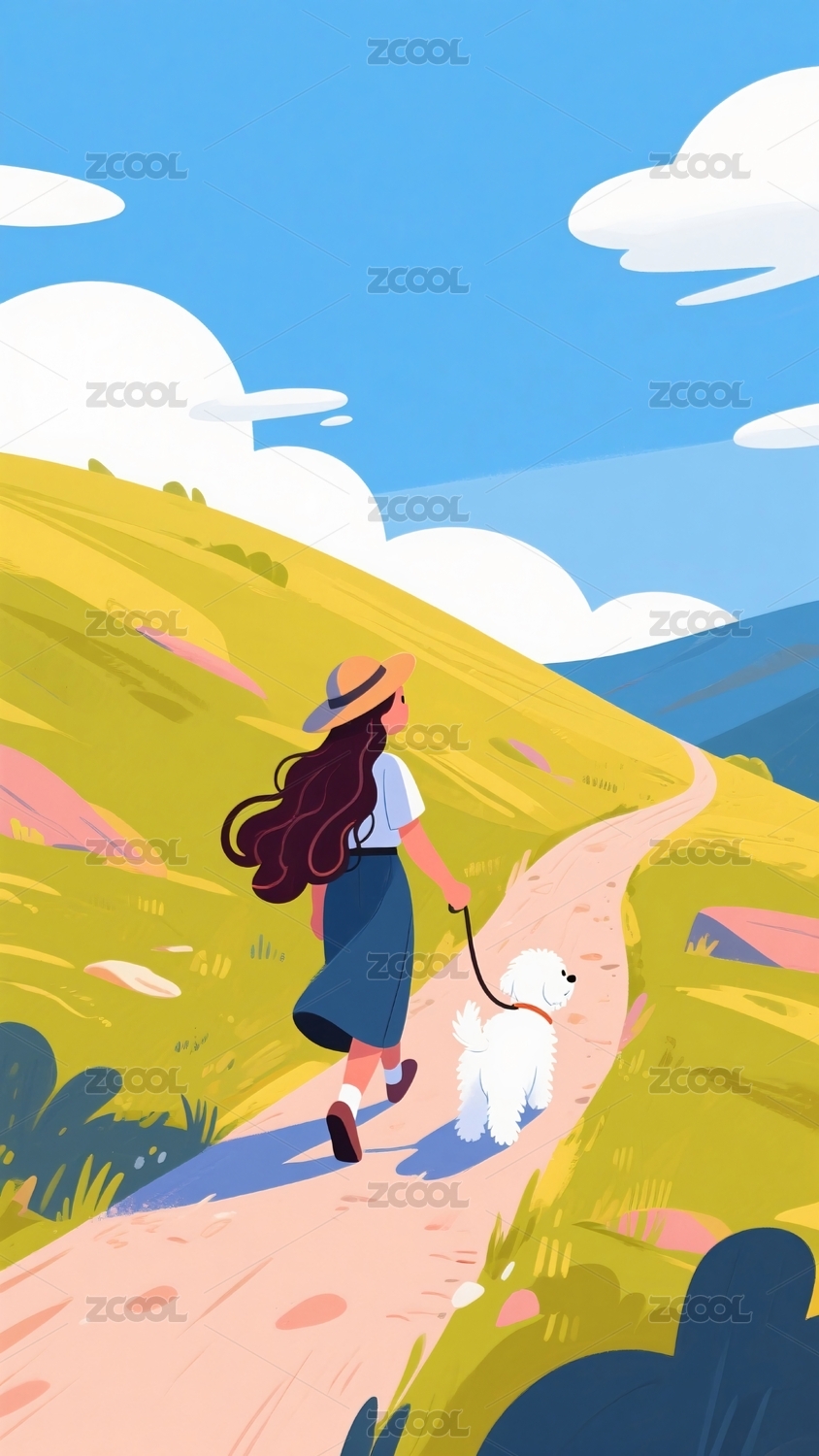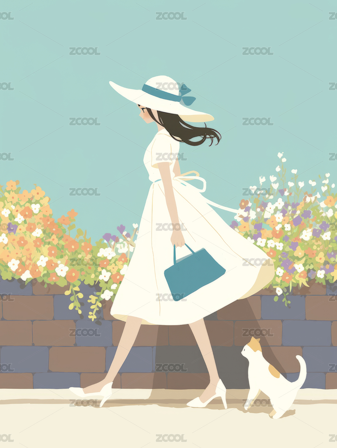 扁平插画一个女孩和猫走在满是花朵的小路上