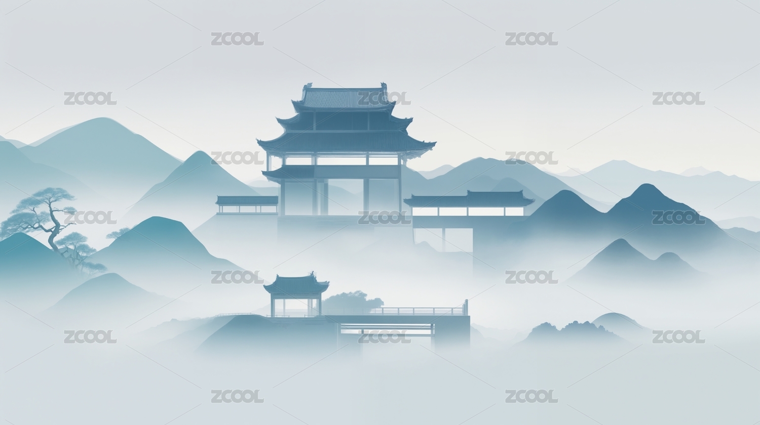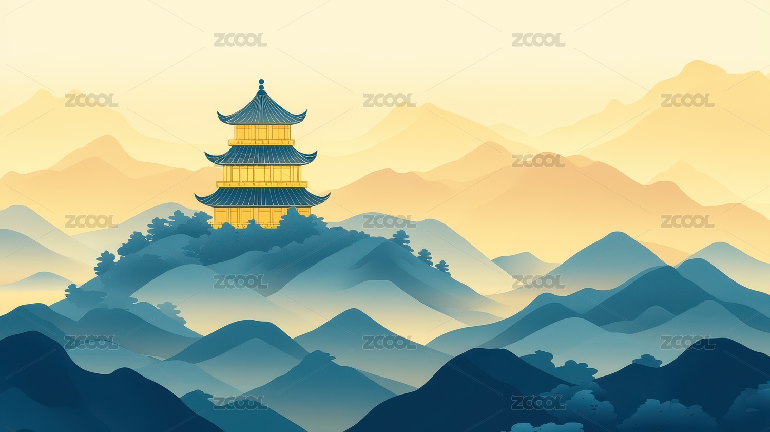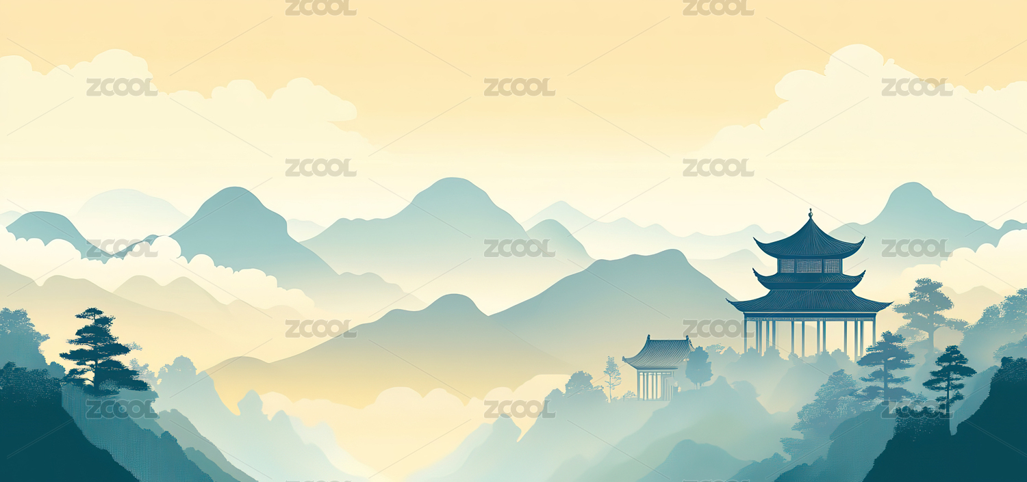山,水,云,雾,晨曦,寺庙,古典,东方,传统,文化