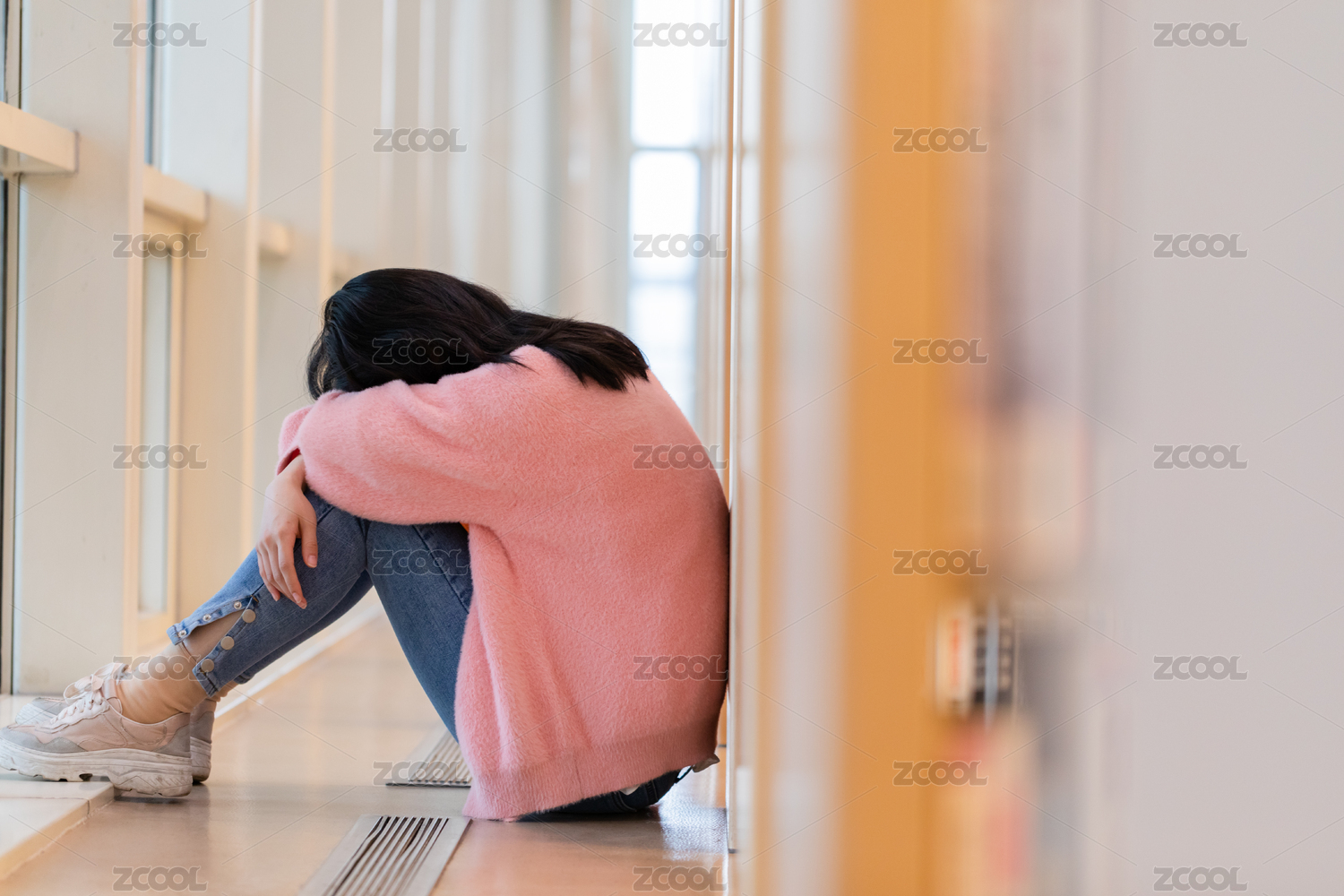 女生靠着书架趴在腿上休息