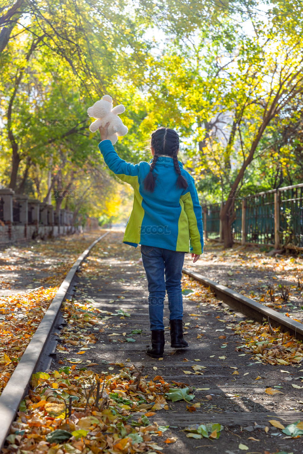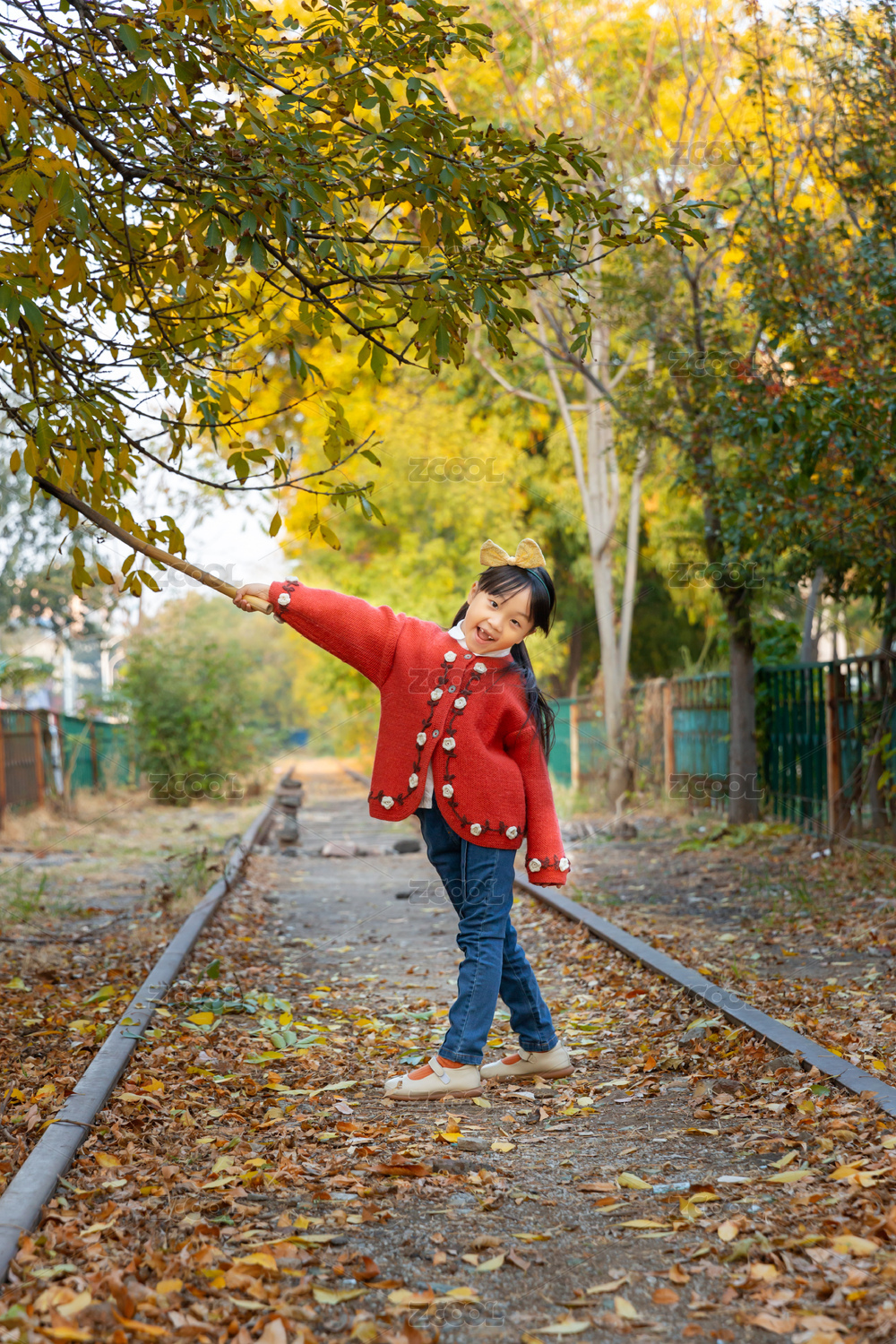 儿童,户外,可爱,小女孩,秋天,秋季,深秋,落叶,铁路,道轨