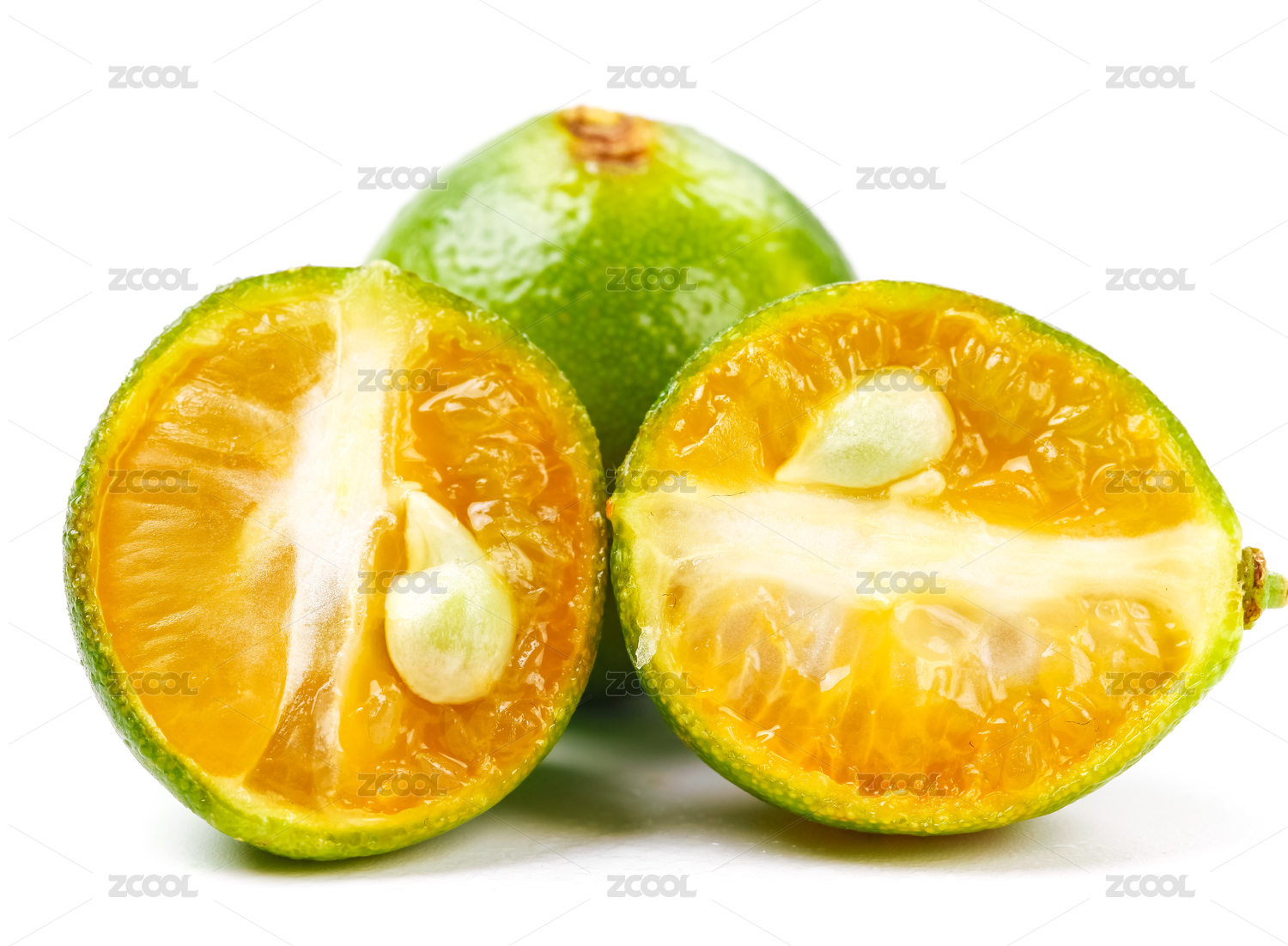 白底上的一个完整金桔旁放一个切开的金桔和两个金桔瓣