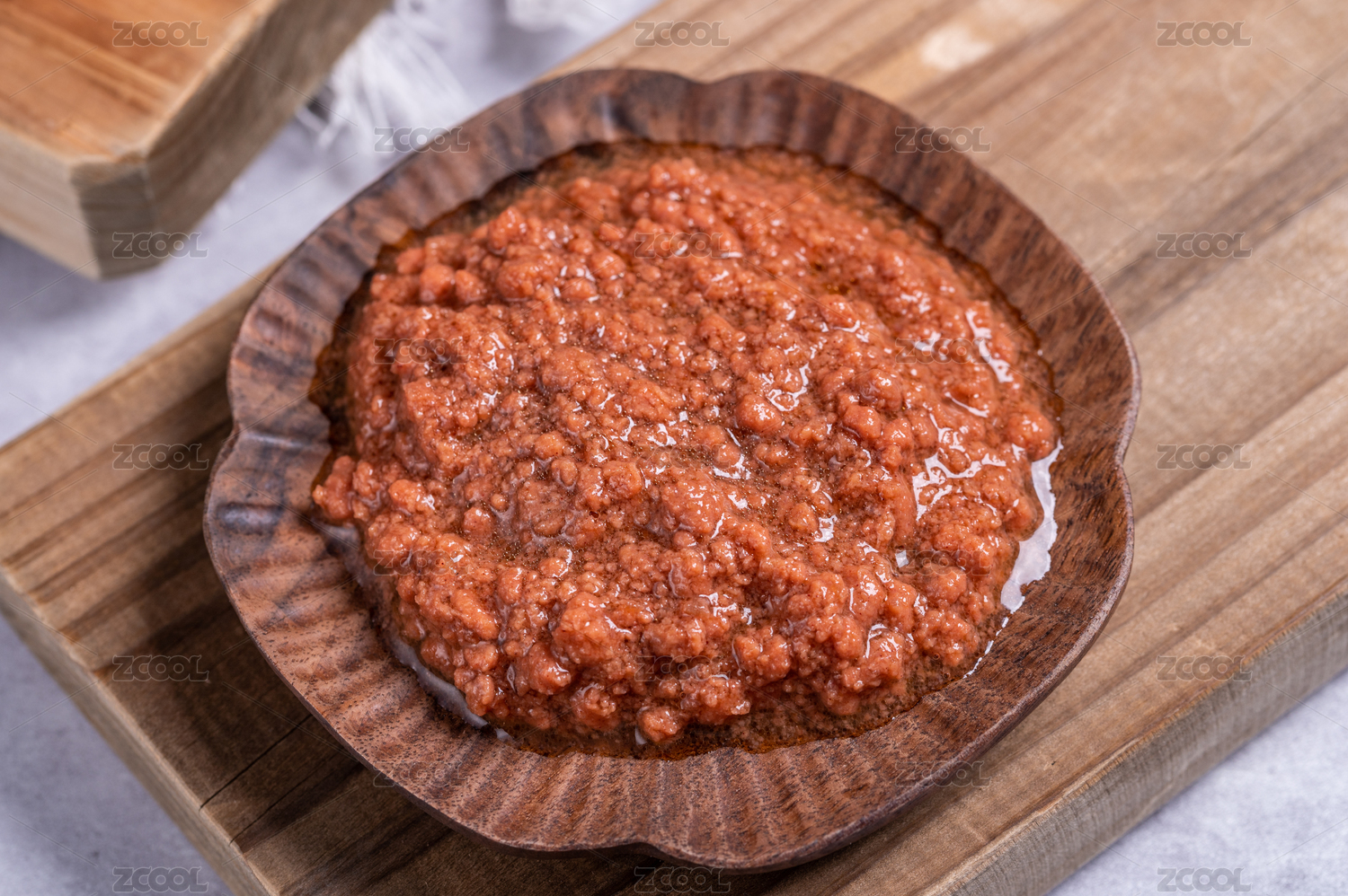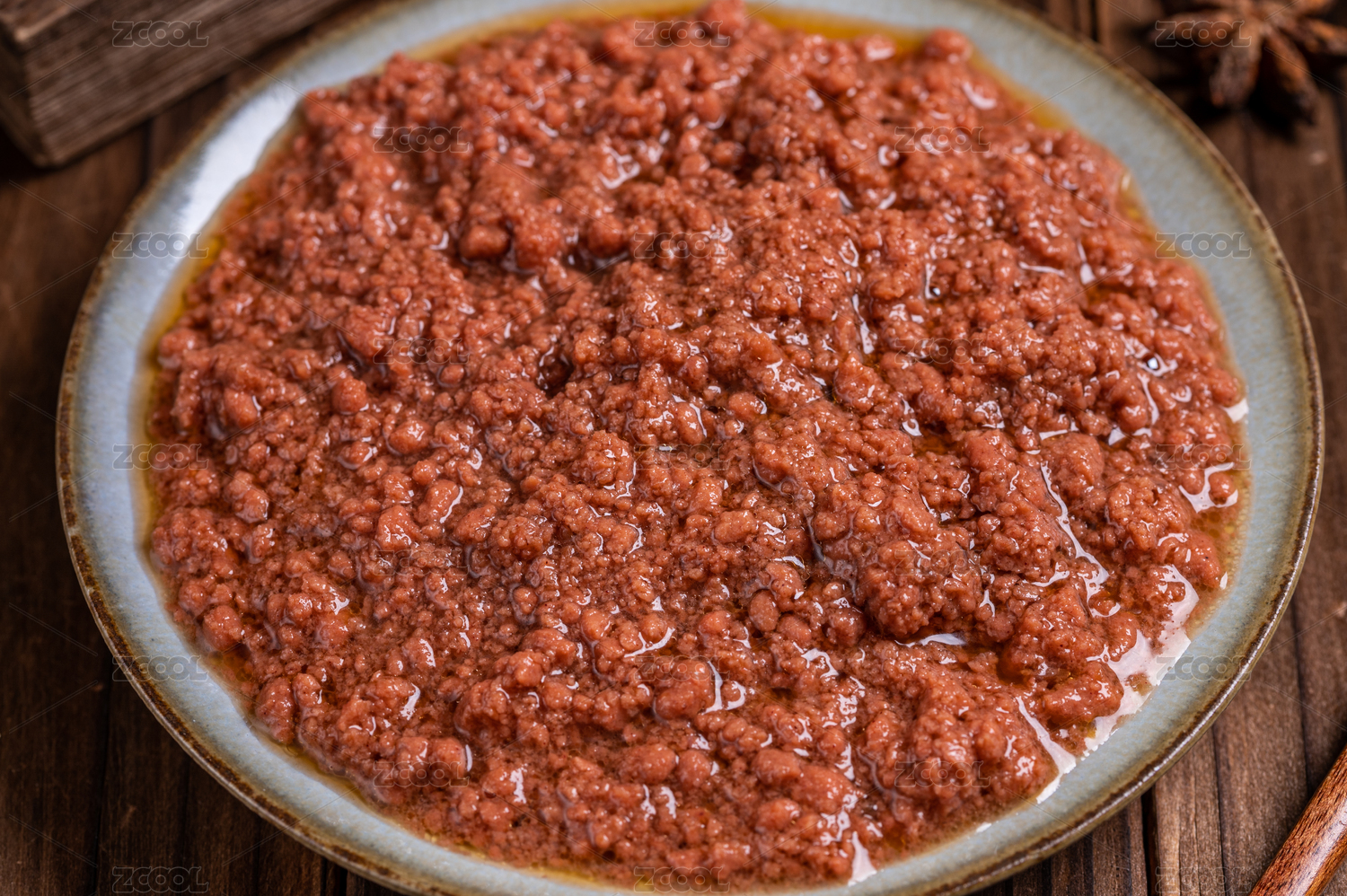 中式木纹背景上盘子里的黄豆酱
