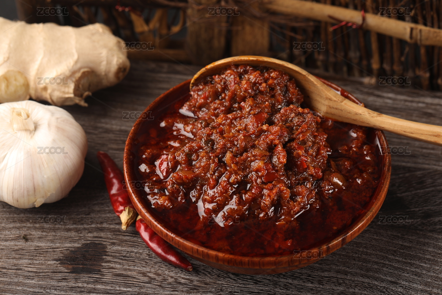 木桌背景下的鲜红剁椒辣椒酱