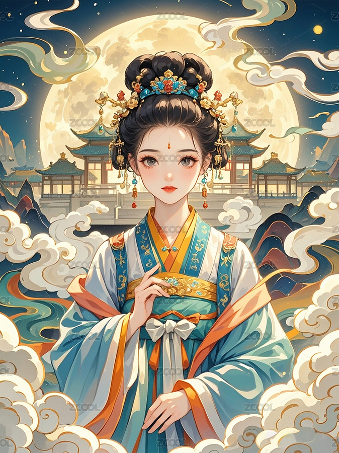 嫦娥,美女,古装,月亮,中秋,国潮风,云朵,宫殿