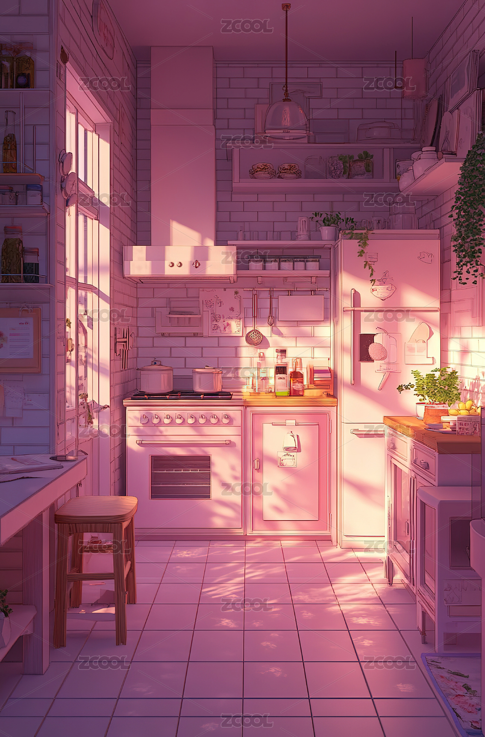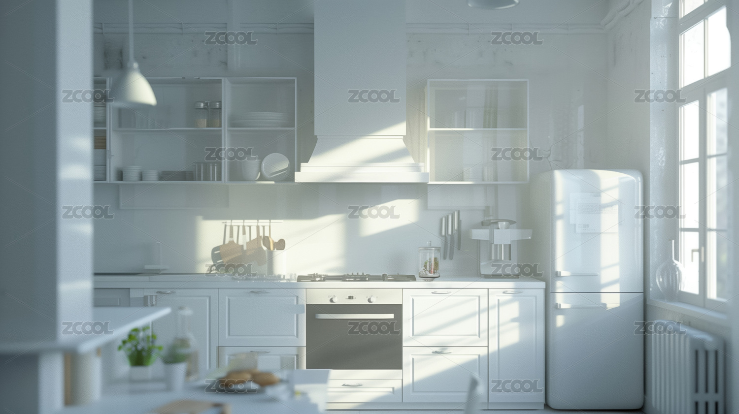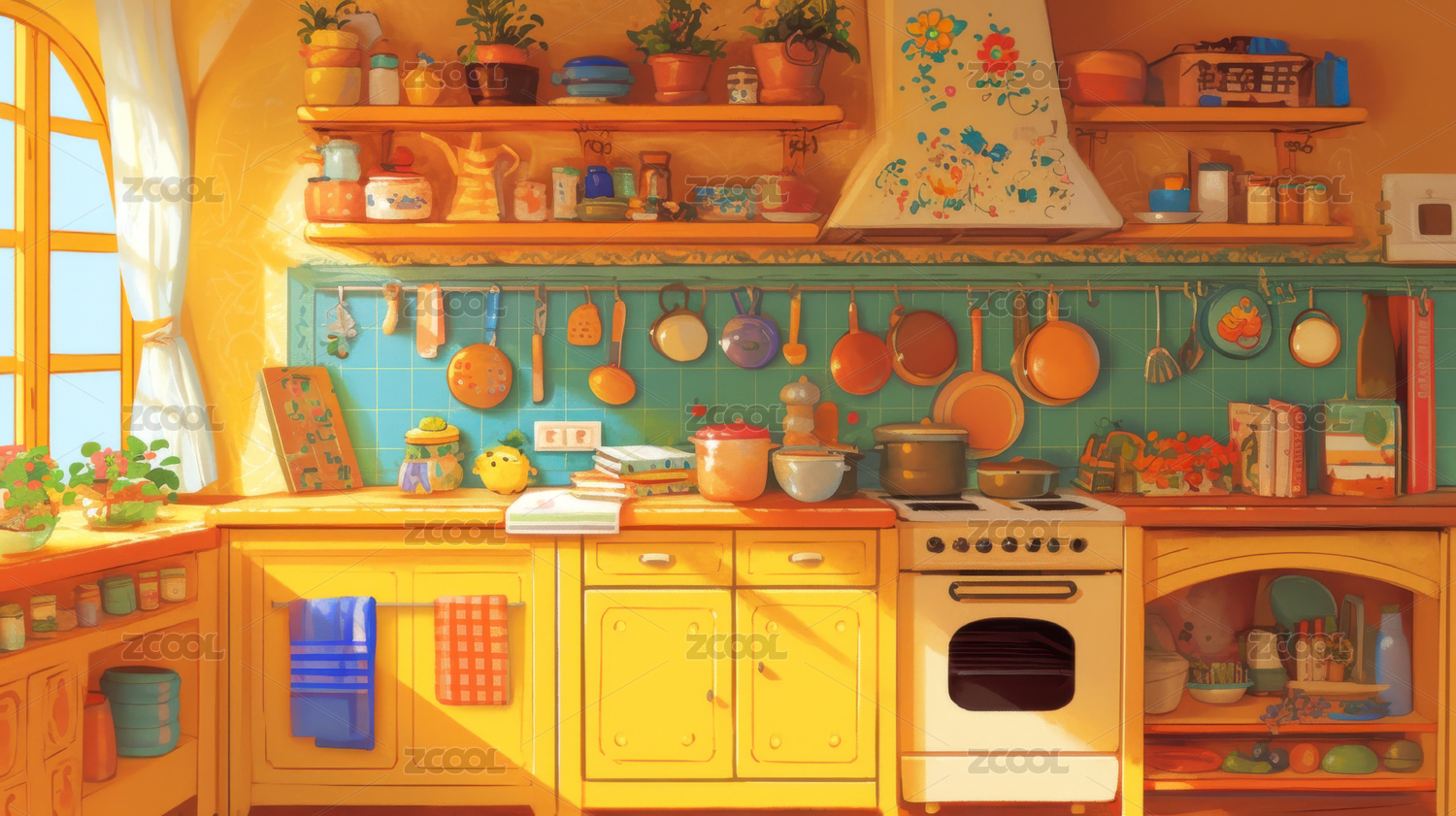 明亮现代厨房黄色冰箱与蓝色橱柜