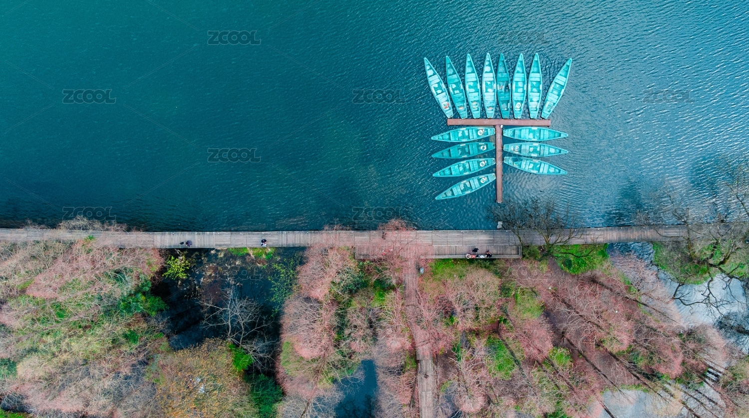 航拍秋天湖畔边的游船码头