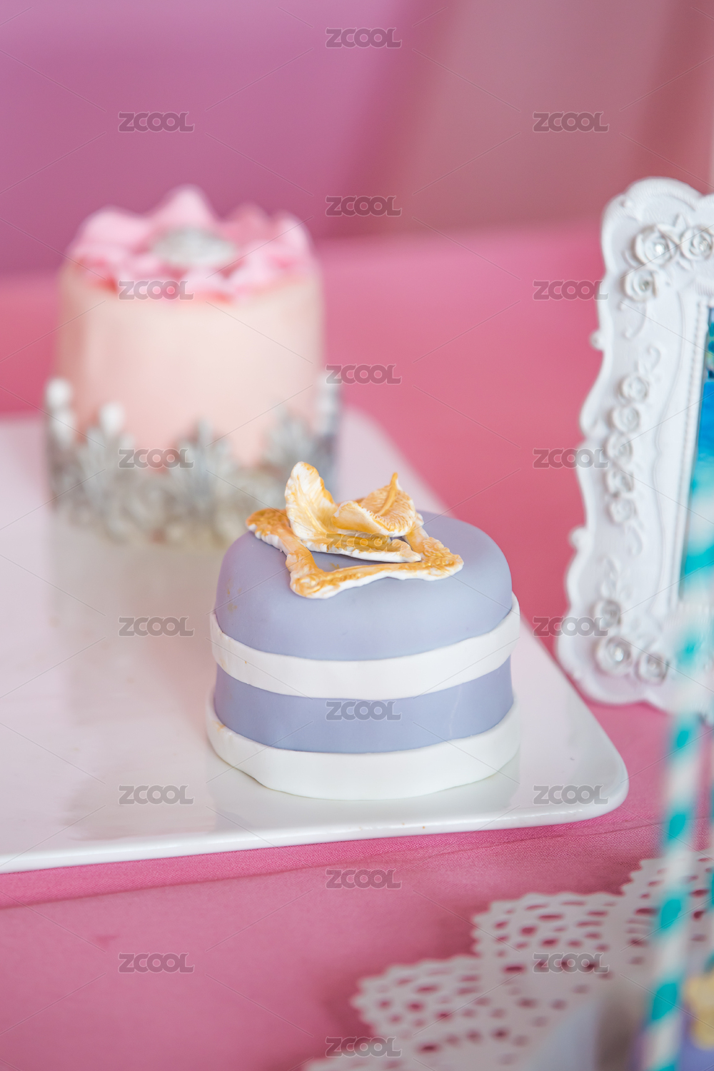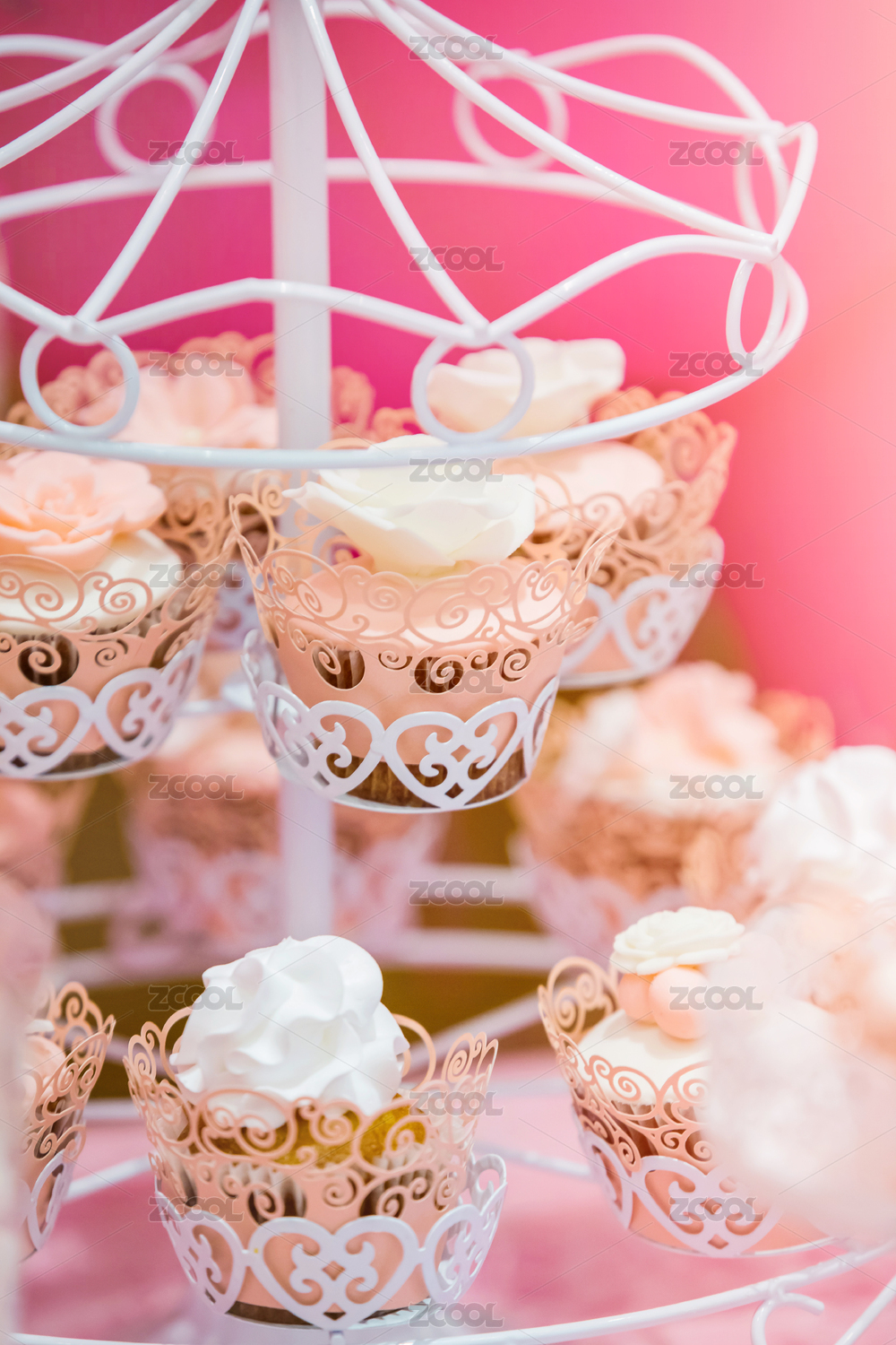 桌子上摆放着粉色饼干和杯子蛋糕。