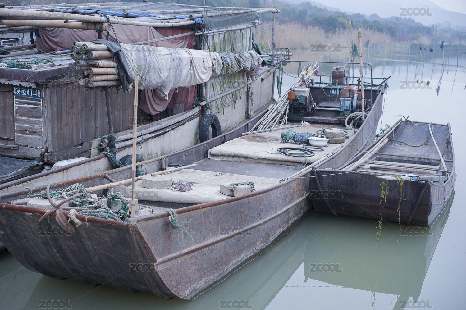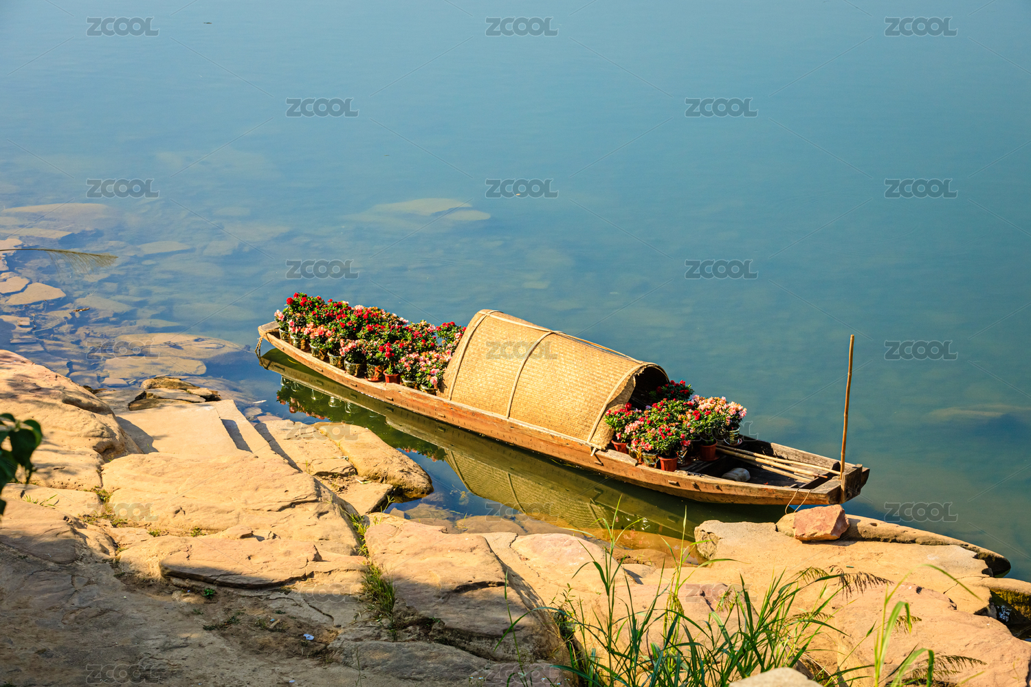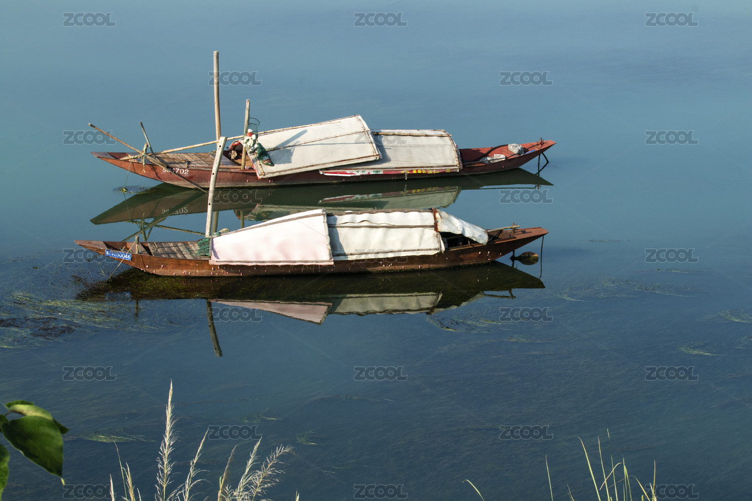 广东清远阳山县青莲镇江边渔船倒影自然风光
