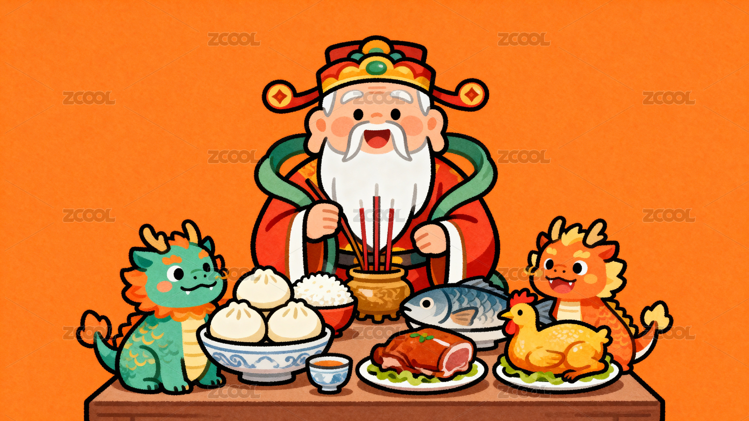 卡通,壁纸,拜神,中国,神仙,传统,新年,装饰,元素,食品