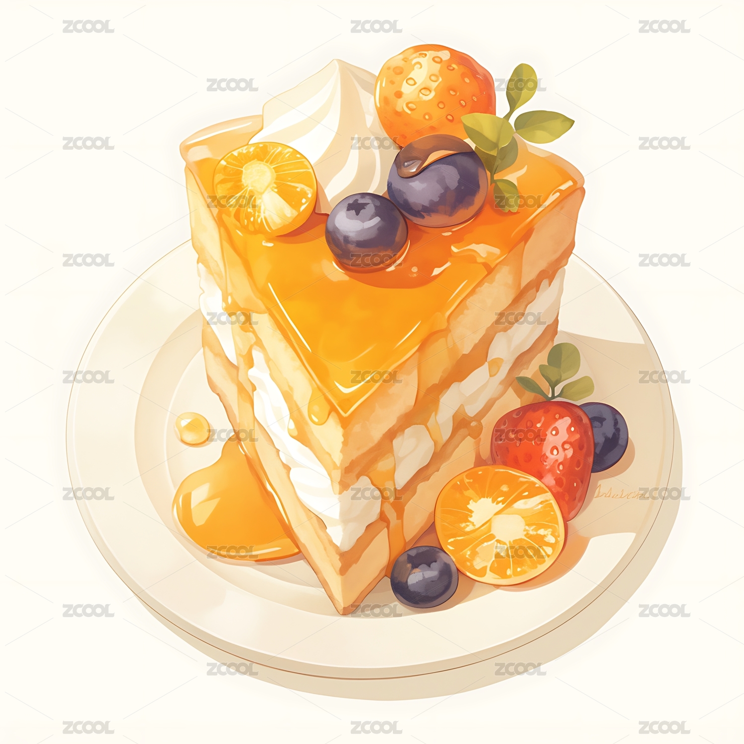 盘子上切开的水果奶油蛋糕3D卡通食品插画