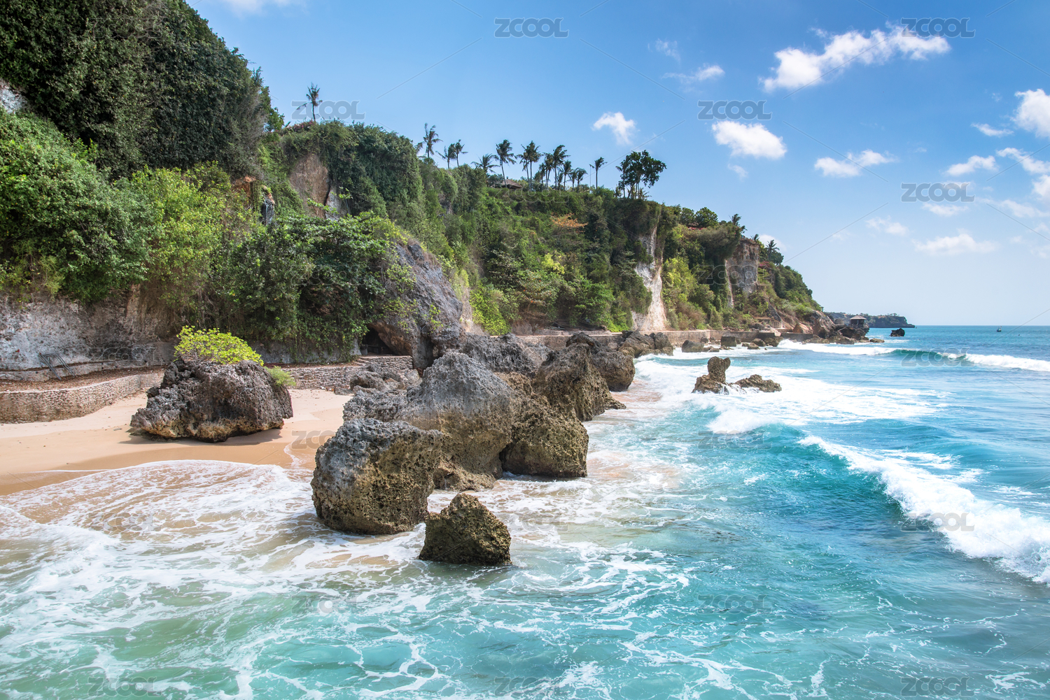 巴厘岛蓝天白云下印度洋边度假酒店海浪沙滩石头悬崖岸边高清大图
