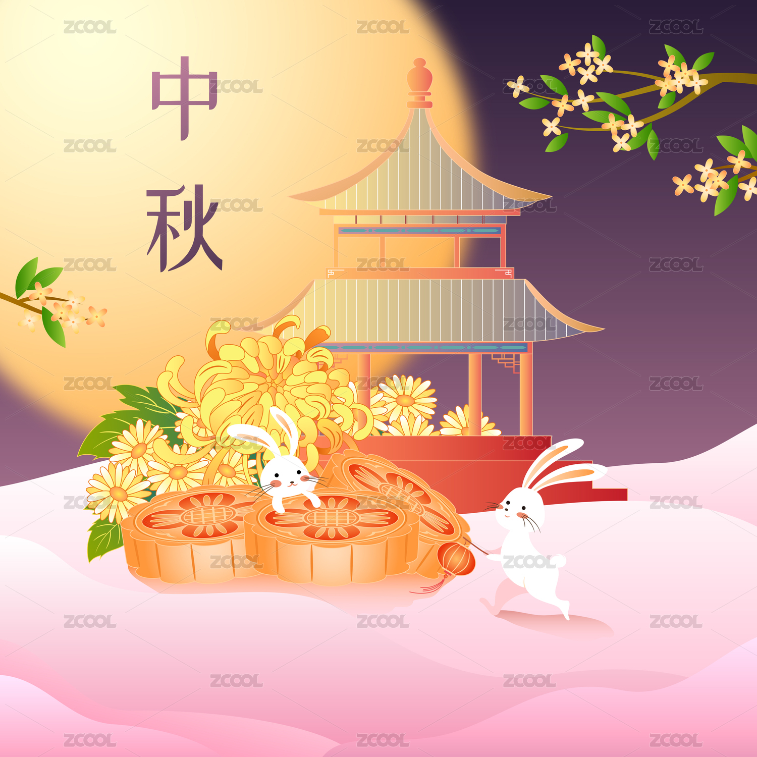 中秋佳节白兔子吃月饼喝桂花酒矢量插画素材
