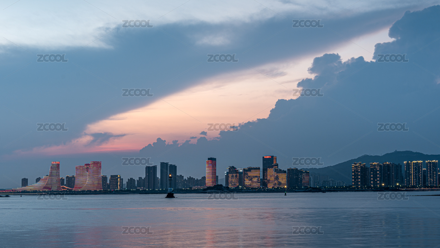 厦门海沧湾黄昏时分的城市天际线与宁静水面