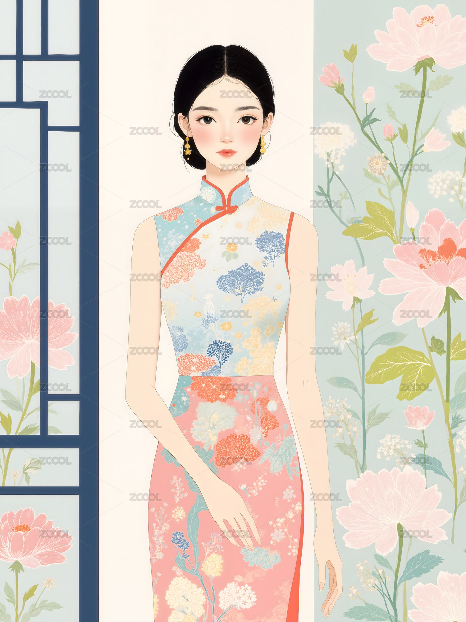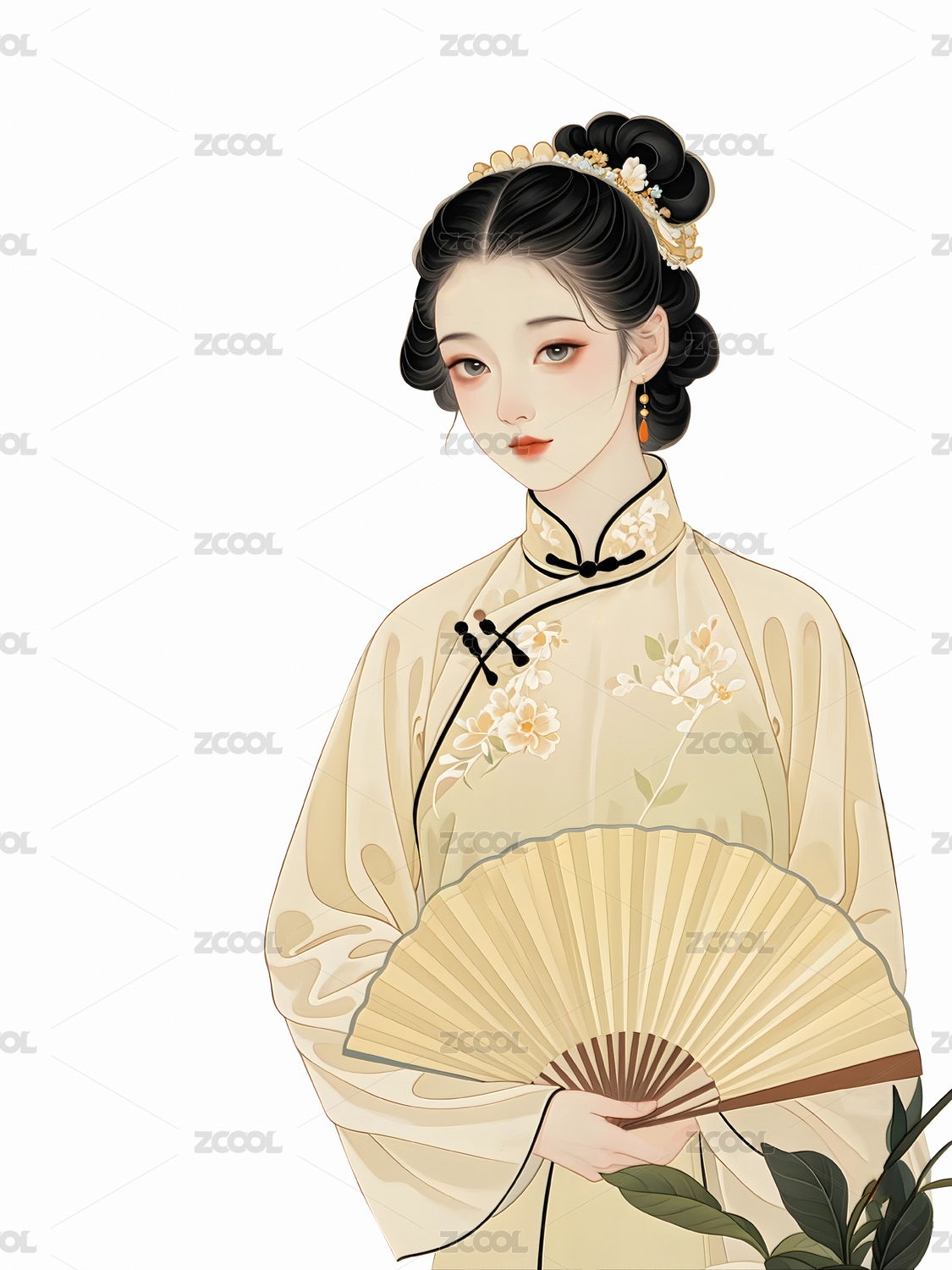 旗袍,女子,团扇,中国风,复古,插画,手绘,美人,服装,人物