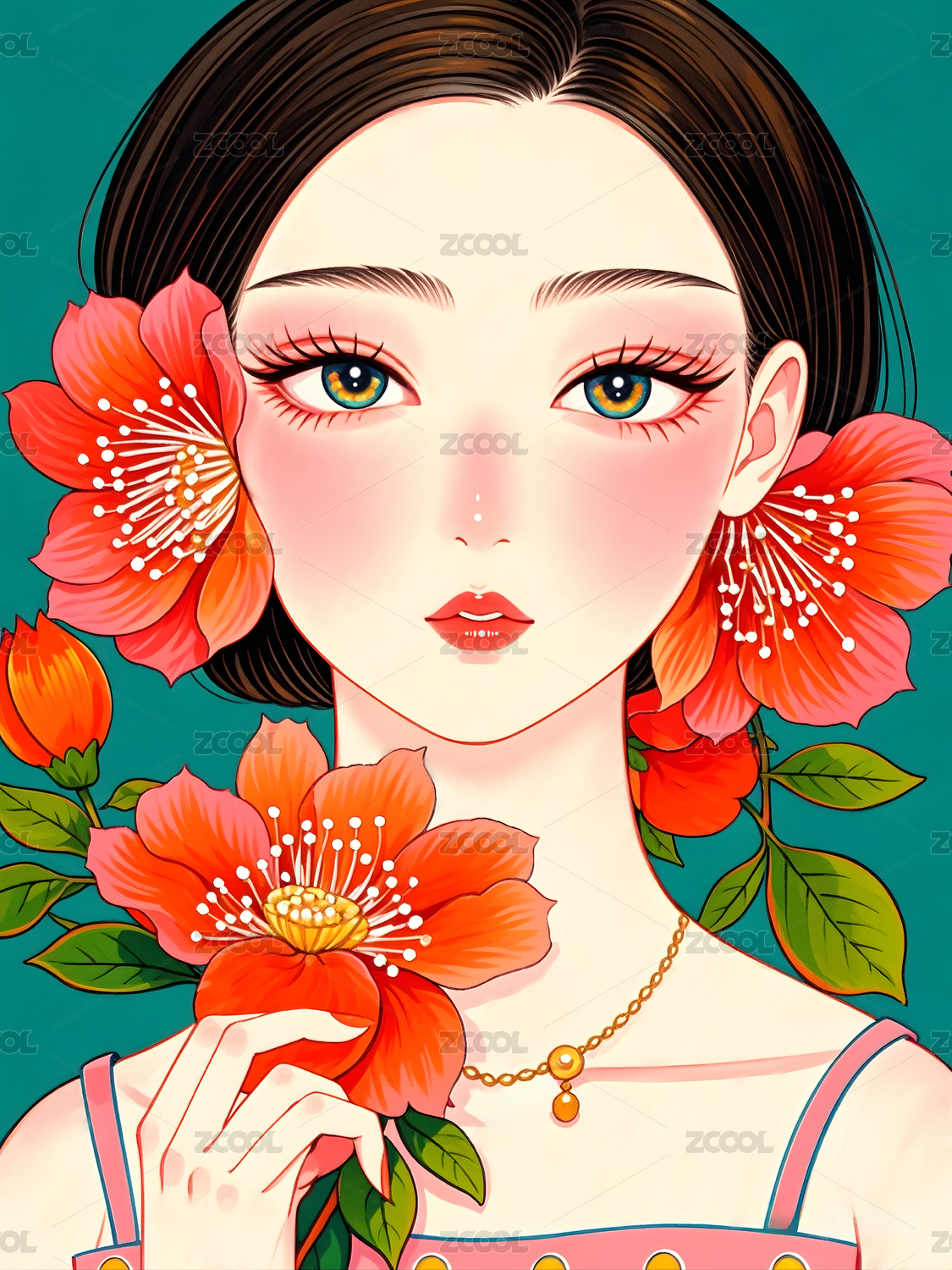 红色,石榴花,少女,十二风信花,十二风信,节气,传统节气节日,风信花,手绘,插画