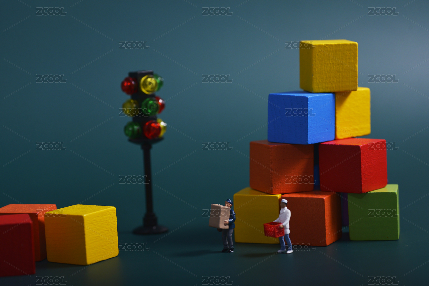 微缩创意品字形堆叠的蓝色积木与人群