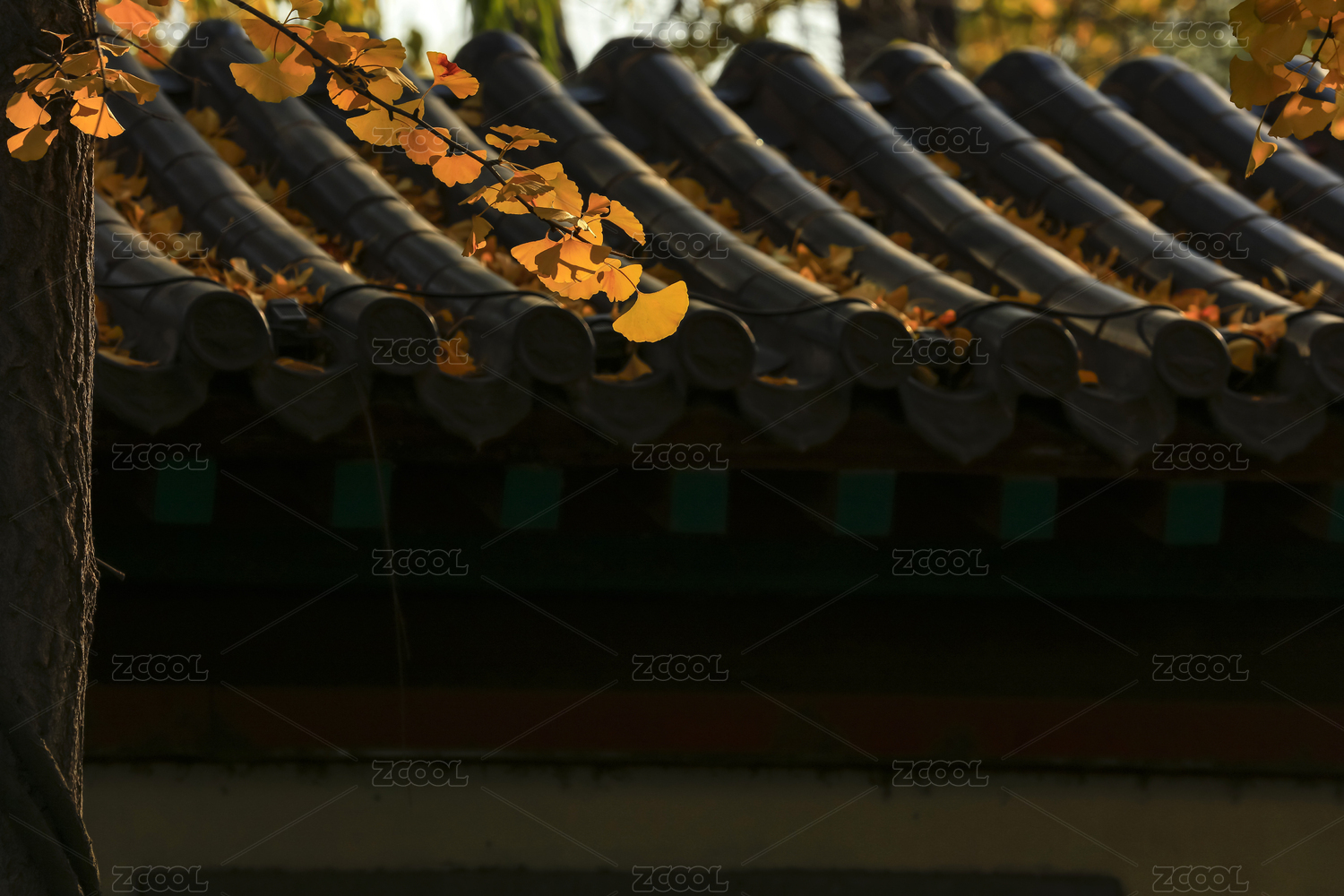 中国北京秋天银杏掩映下的宫墙屋檐
