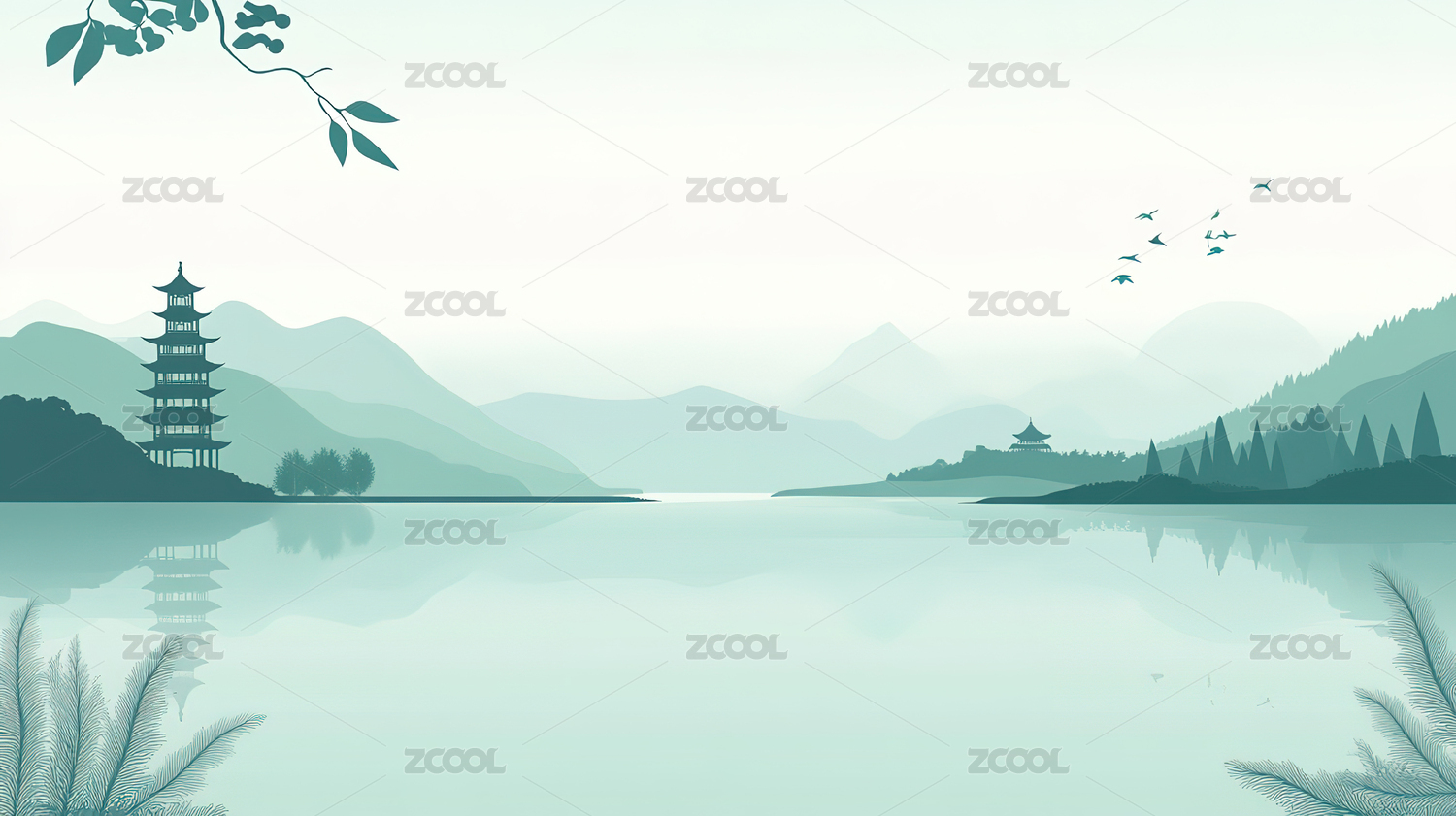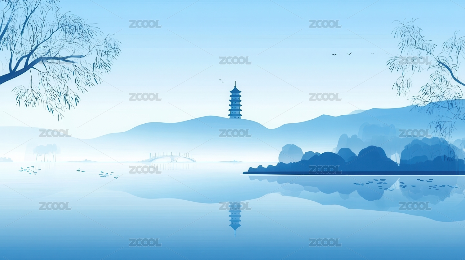 宁静的蓝色山水画
