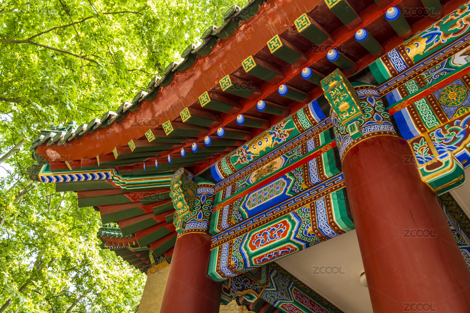 中国山东省济南市趵突泉景区内古建筑彩绘斗角