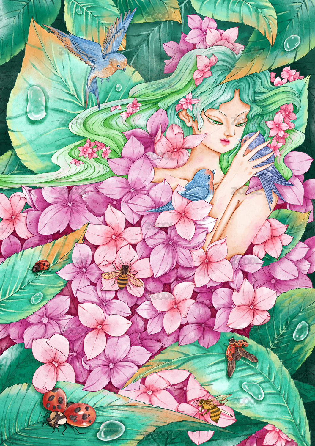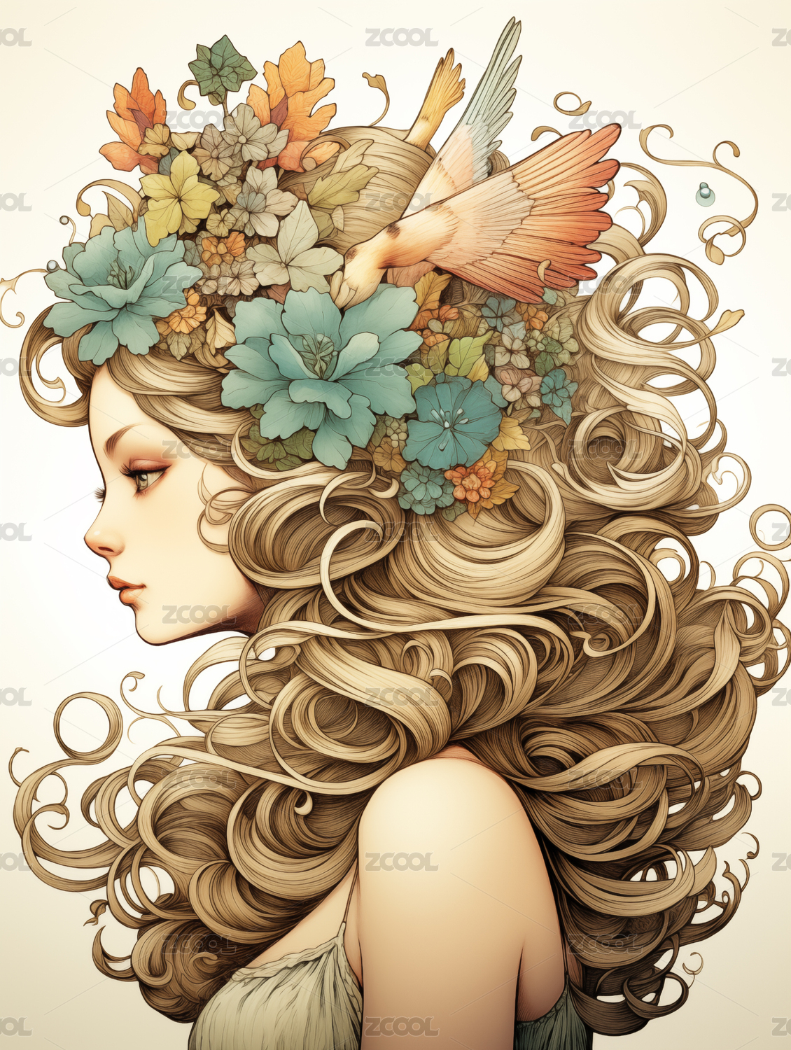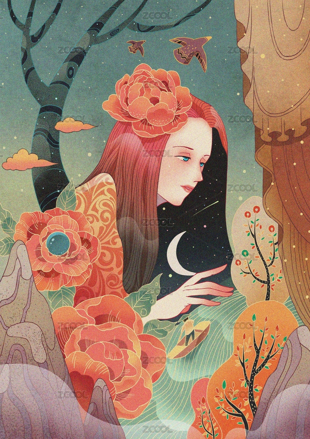 艺术风格花卉少女插画