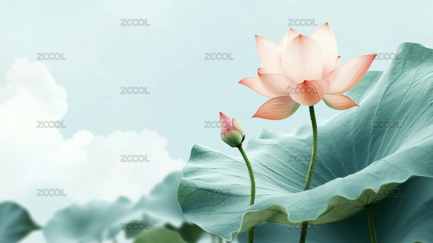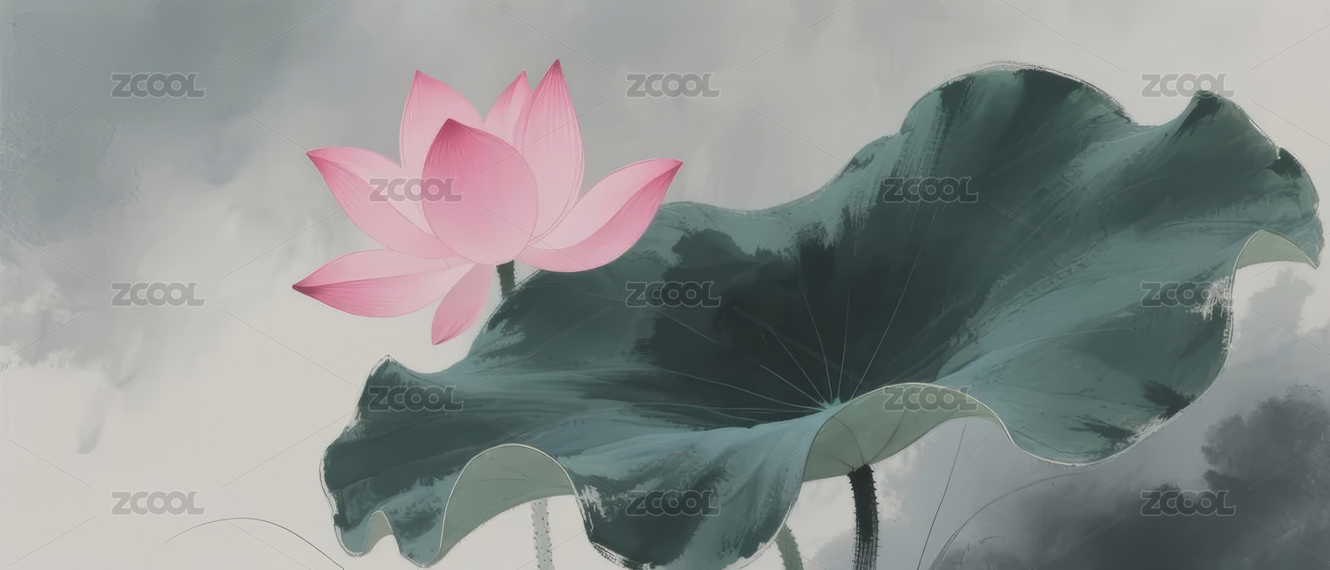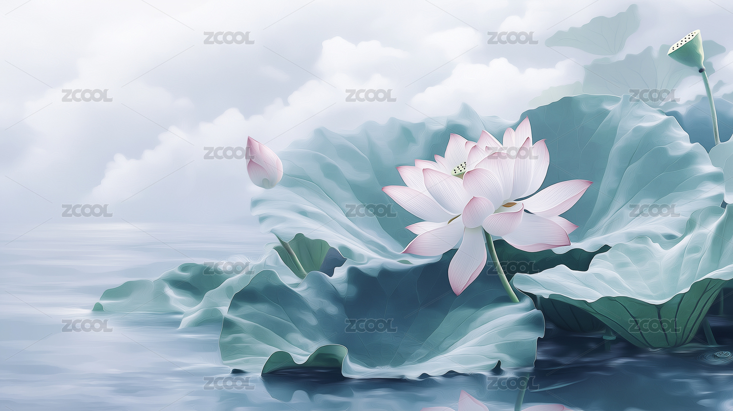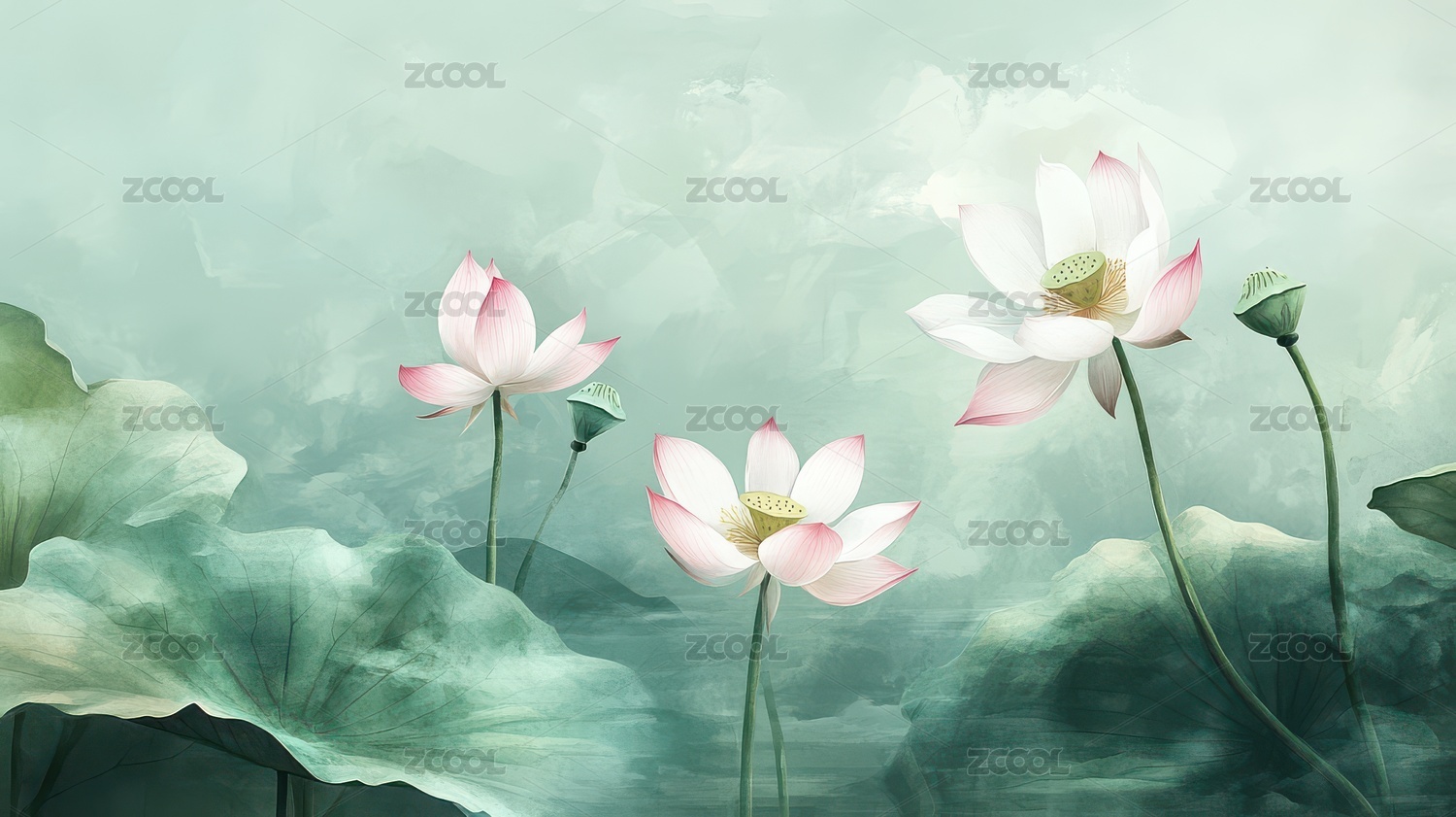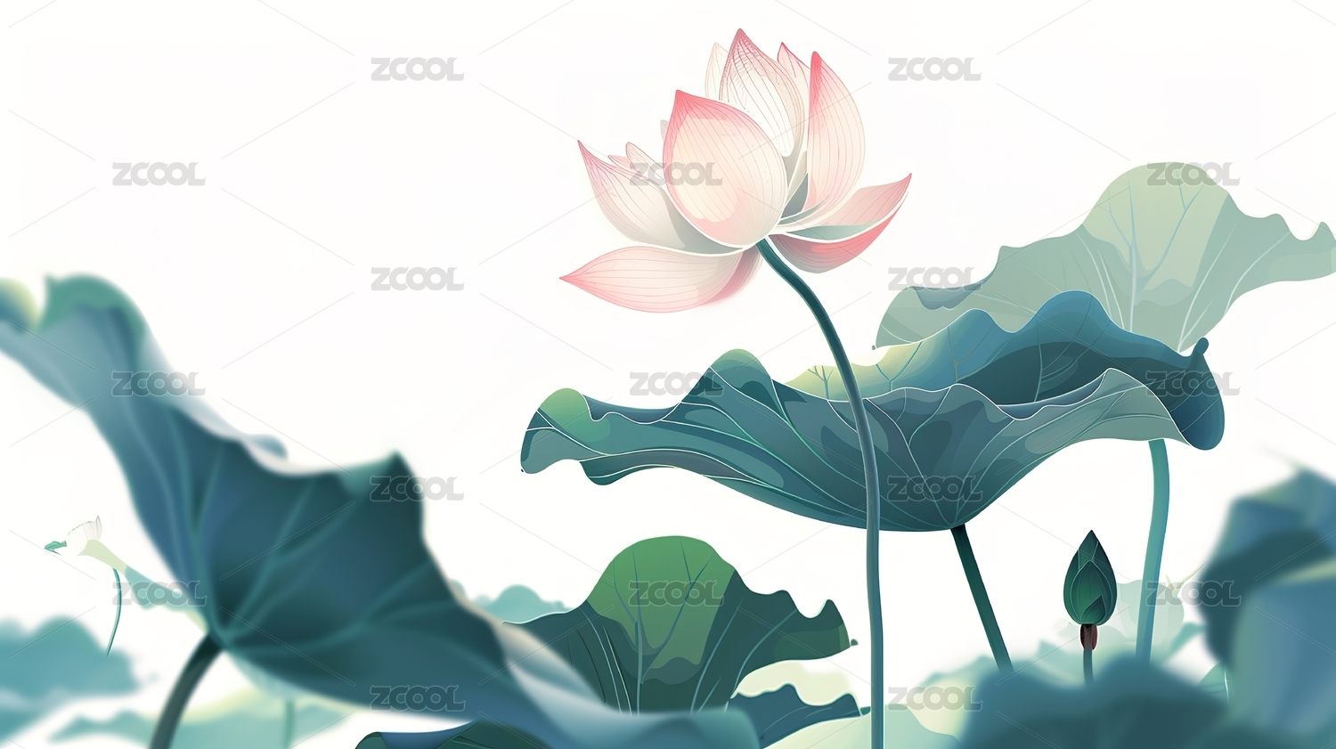 中国风荷花荷叶淡彩水墨插画壁纸背景