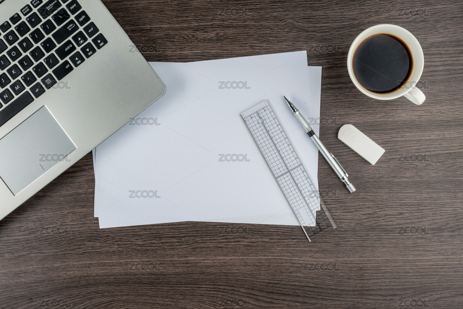 笔记本电脑,纸笔尺子和橡皮与办公桌的咖啡杯