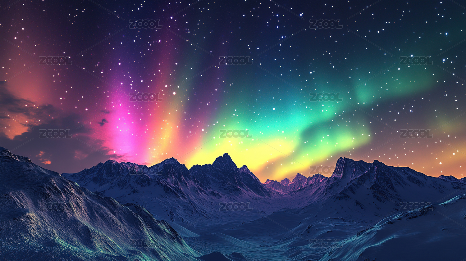极光下的雪山夜景