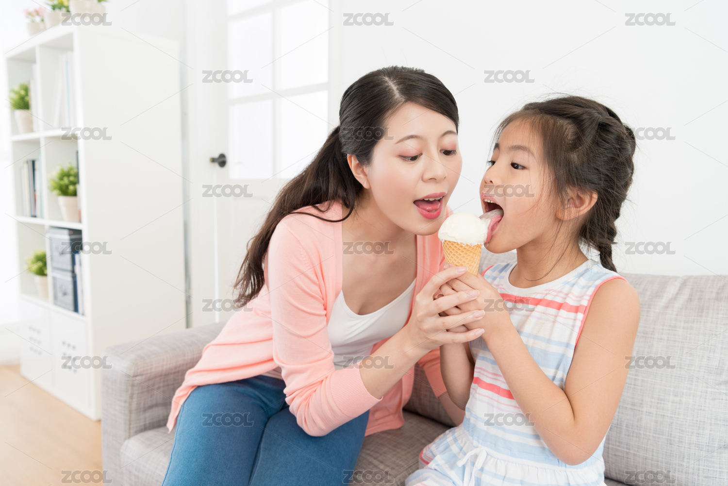 幸福美丽的母亲坐在沙发上与可爱的女儿美女舔冰淇淋在家里享受夏季客厅的地板上。