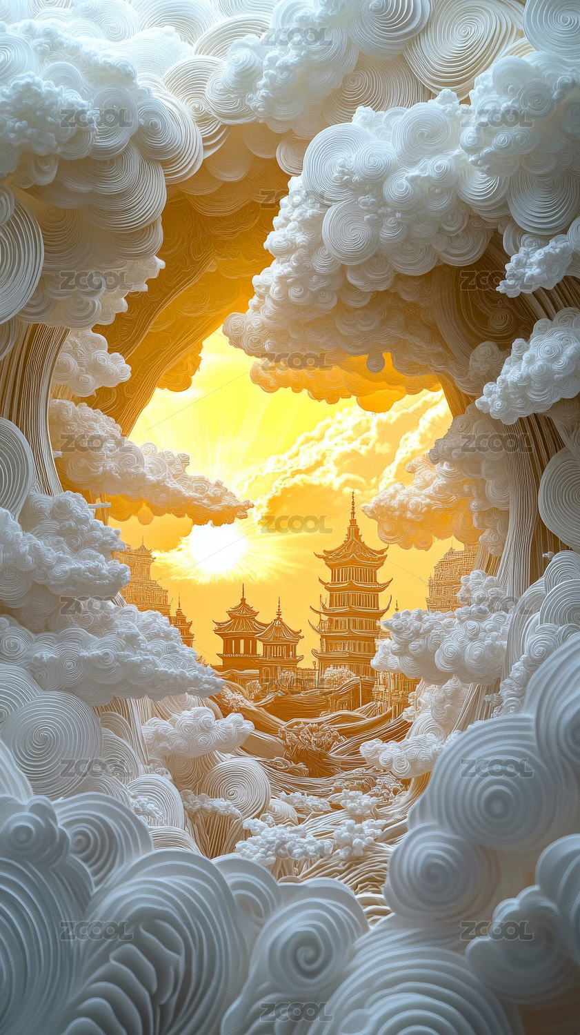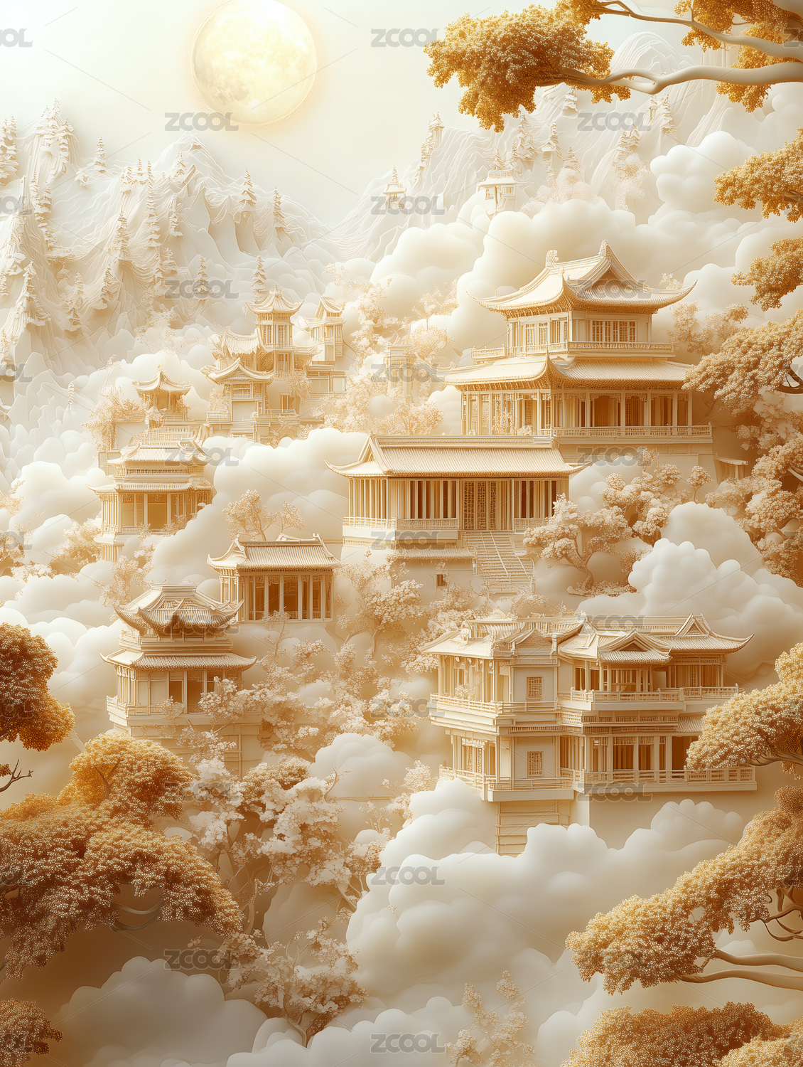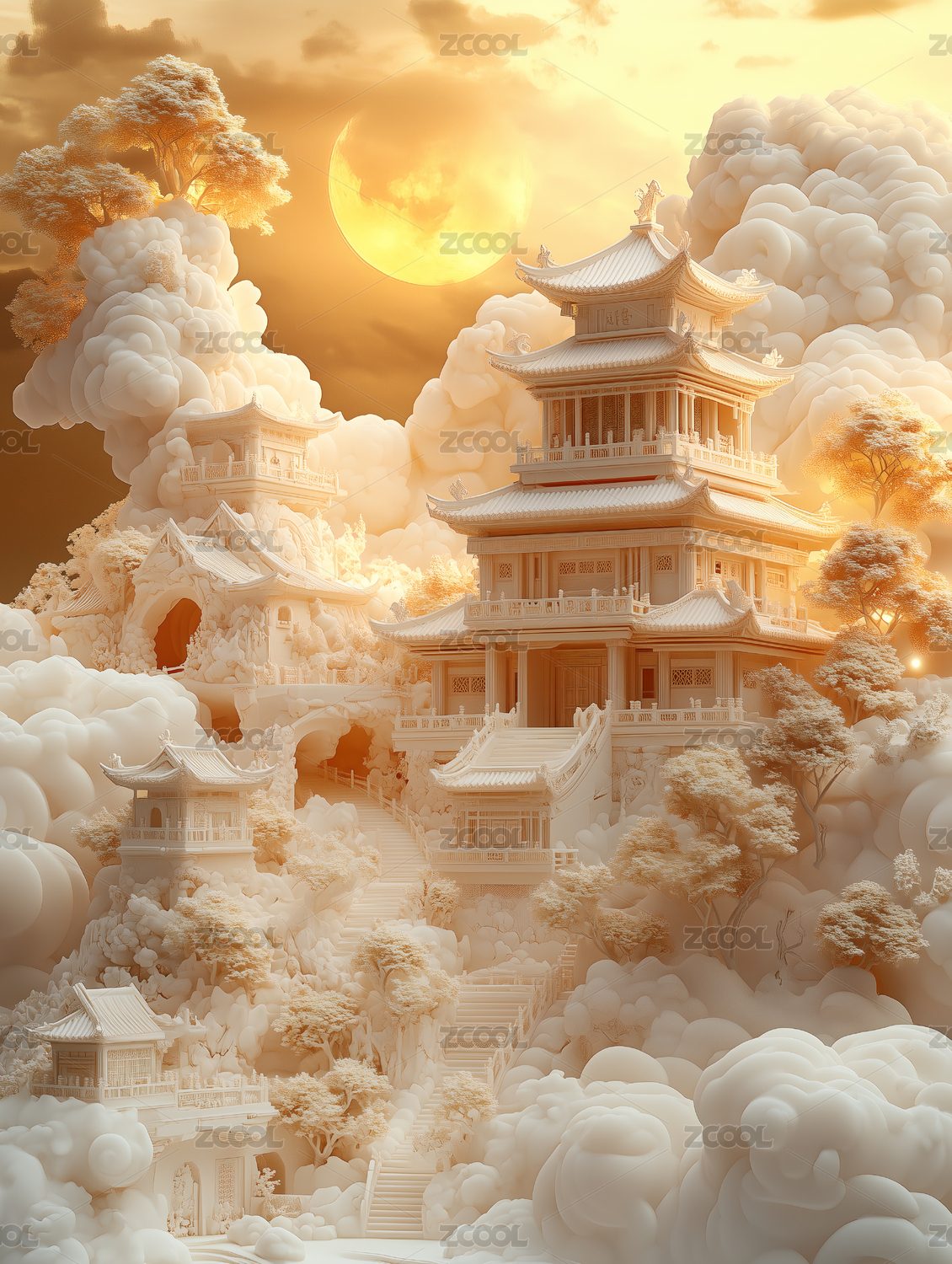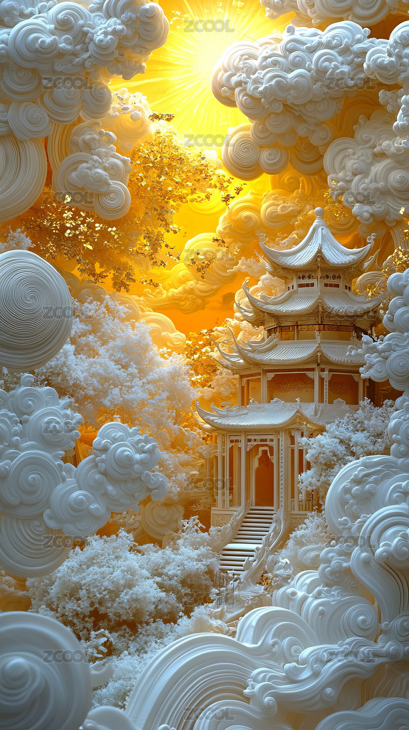 国风太阳当空纯净古典建筑园林3D卡通场景