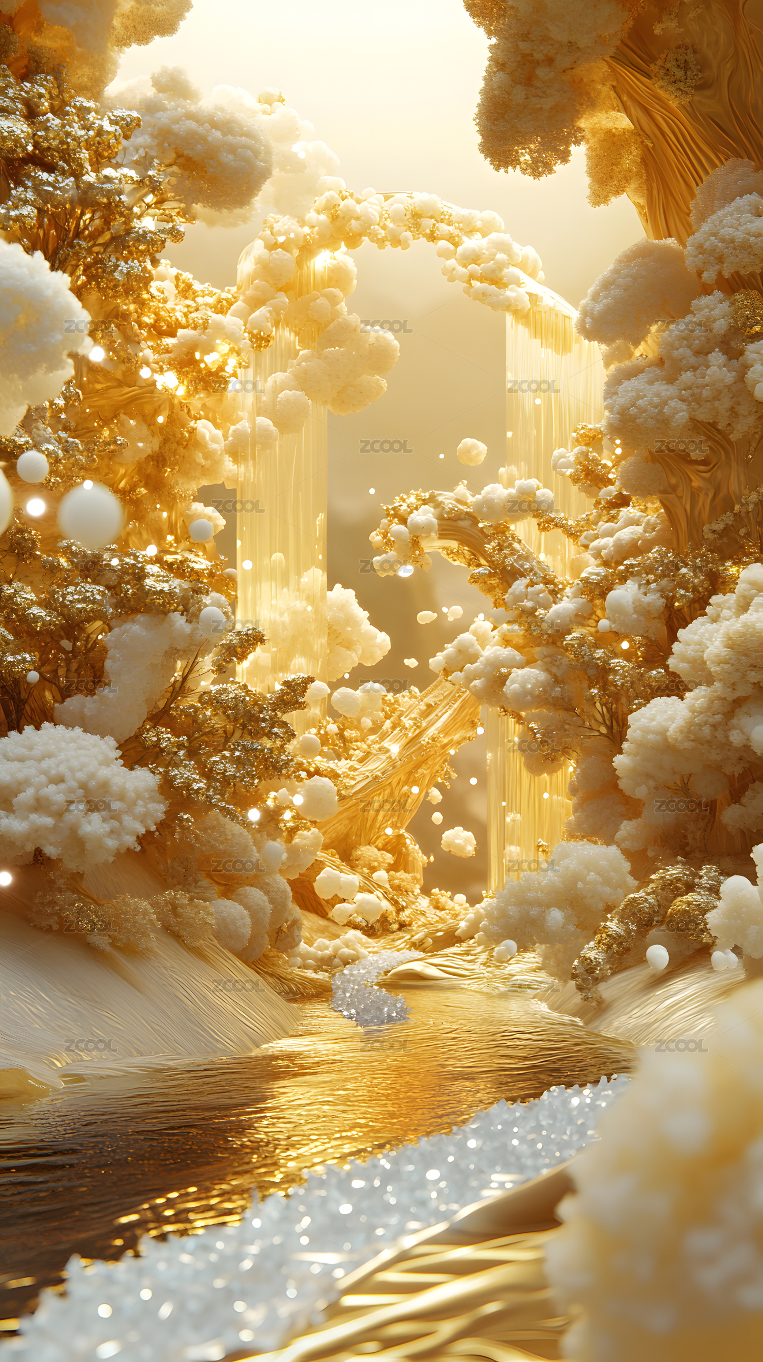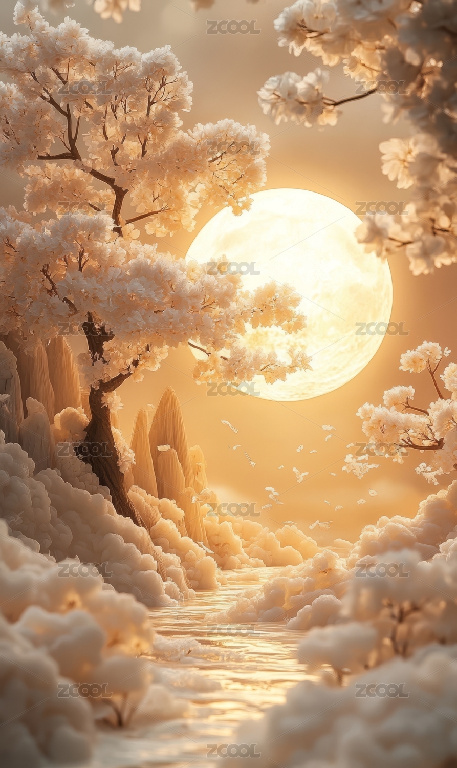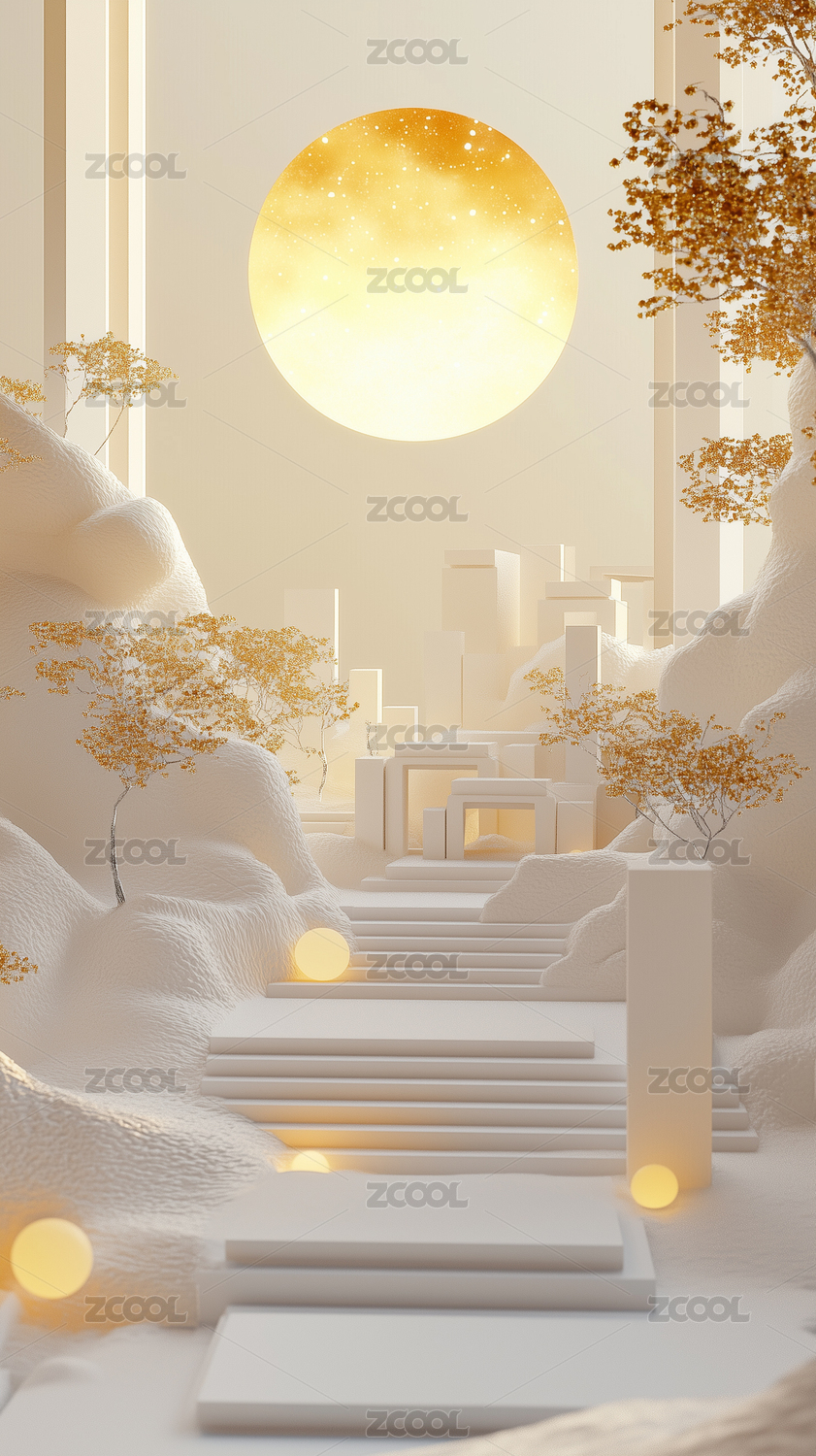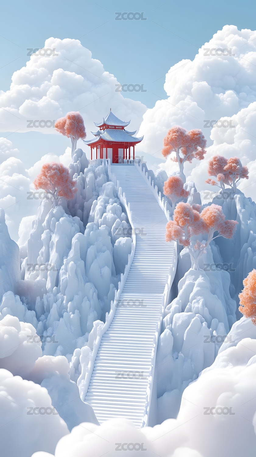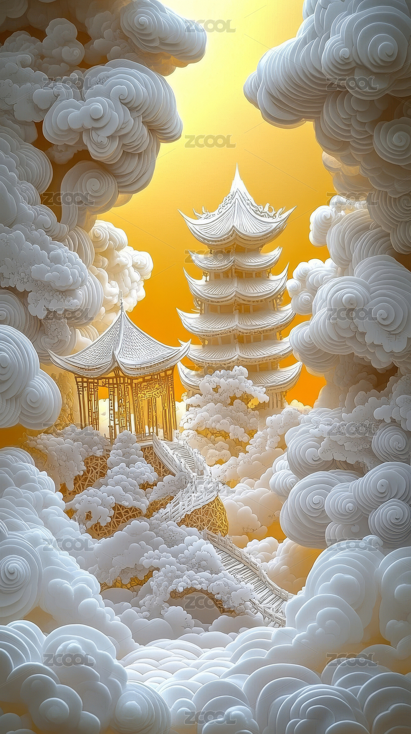 国风太阳当空纯净古典建筑园林3D卡通场景