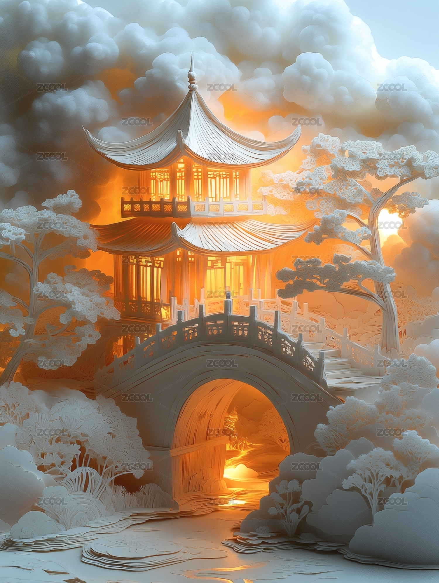 剪纸,纸艺,中国风,亭台楼阁,月色,月光,传统文化,艺术,装饰,设计