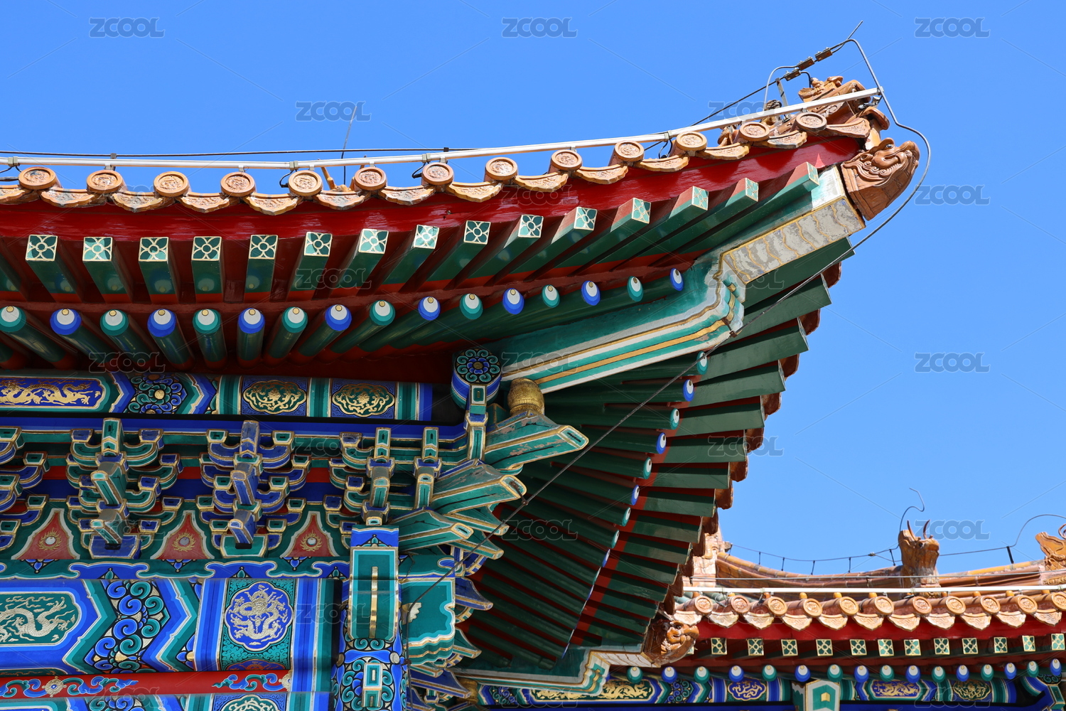 中国北京颐和园古建一角—飞檐彩绘描金万字纹龙纹