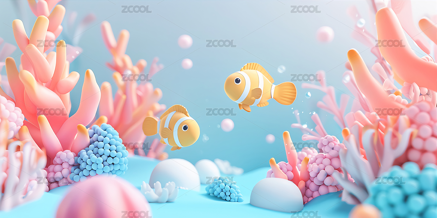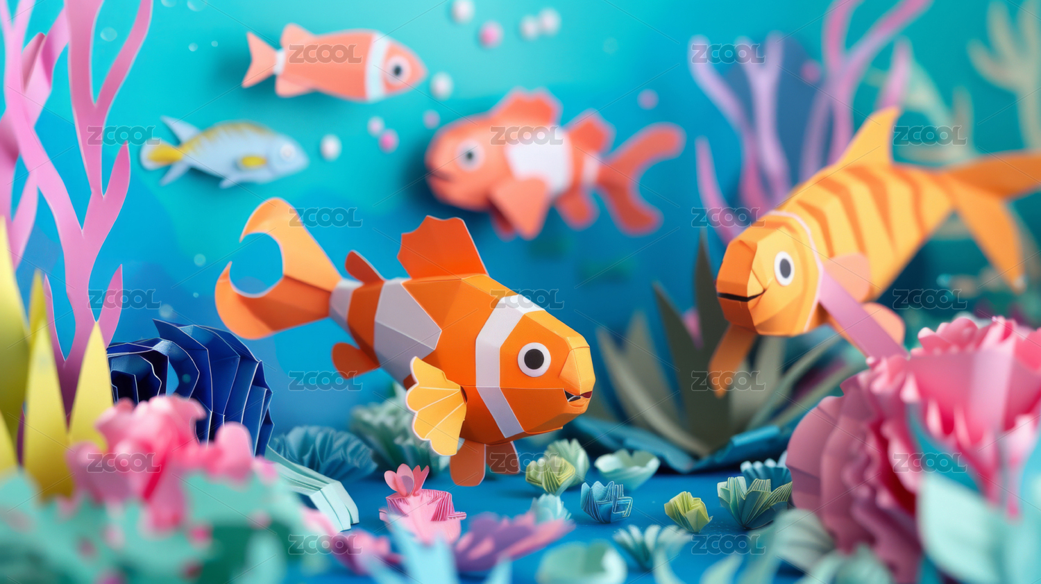 卡通,水下,海底,鱼,水草,可爱,童趣,纸艺,风格