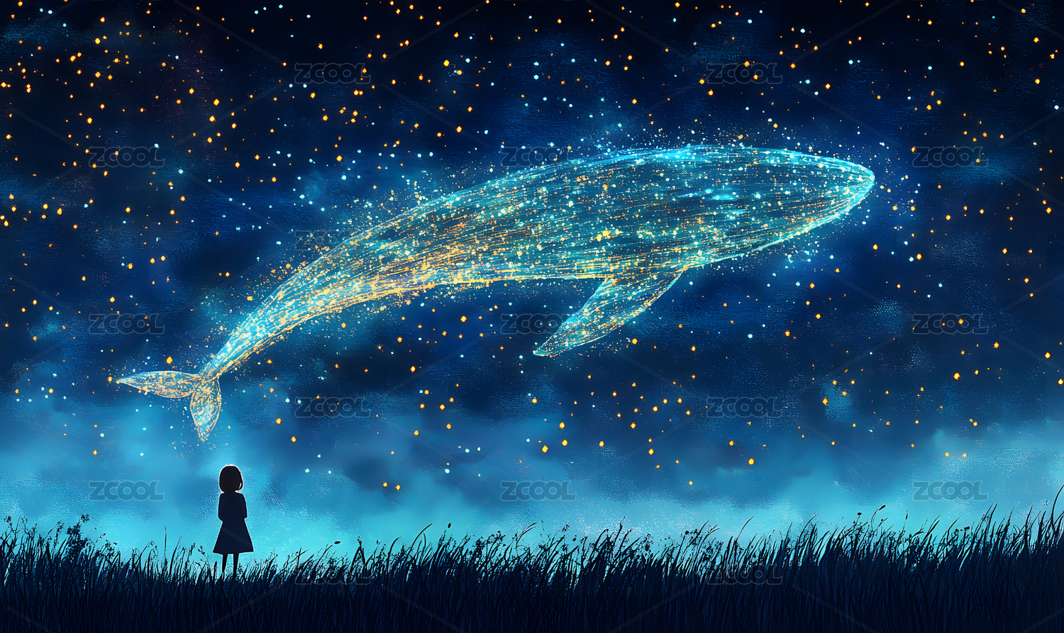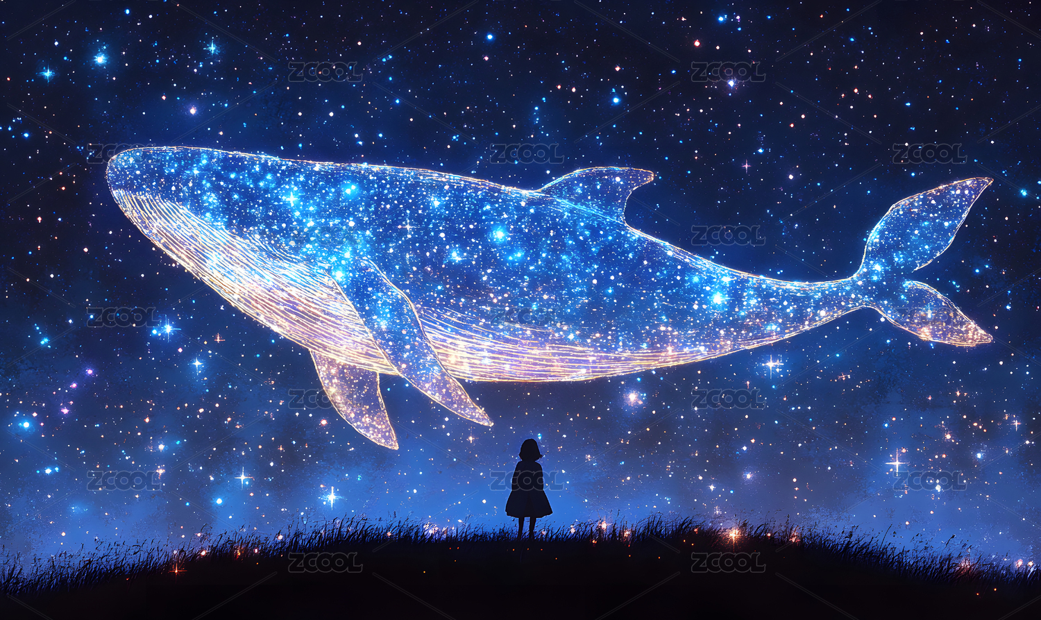 仰望天空的少女和空中的鲸鱼梦幻插画壁纸
