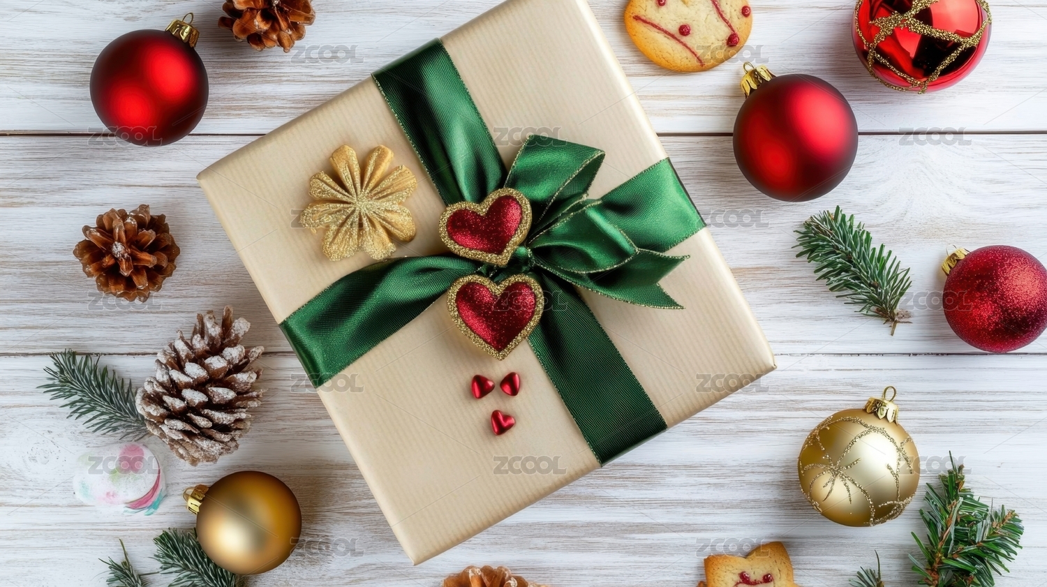美丽的粉红色礼物,圣诞节装饰品,粉色礼盒,圣诞树,圣诞球和松果在桌子上,俯视图