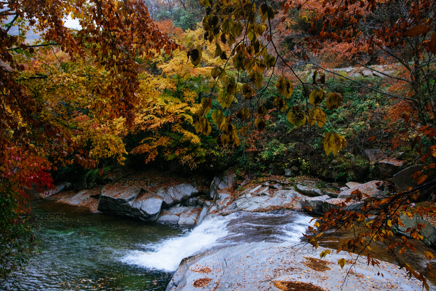 山涧美丽的红叶和落叶自然风光
