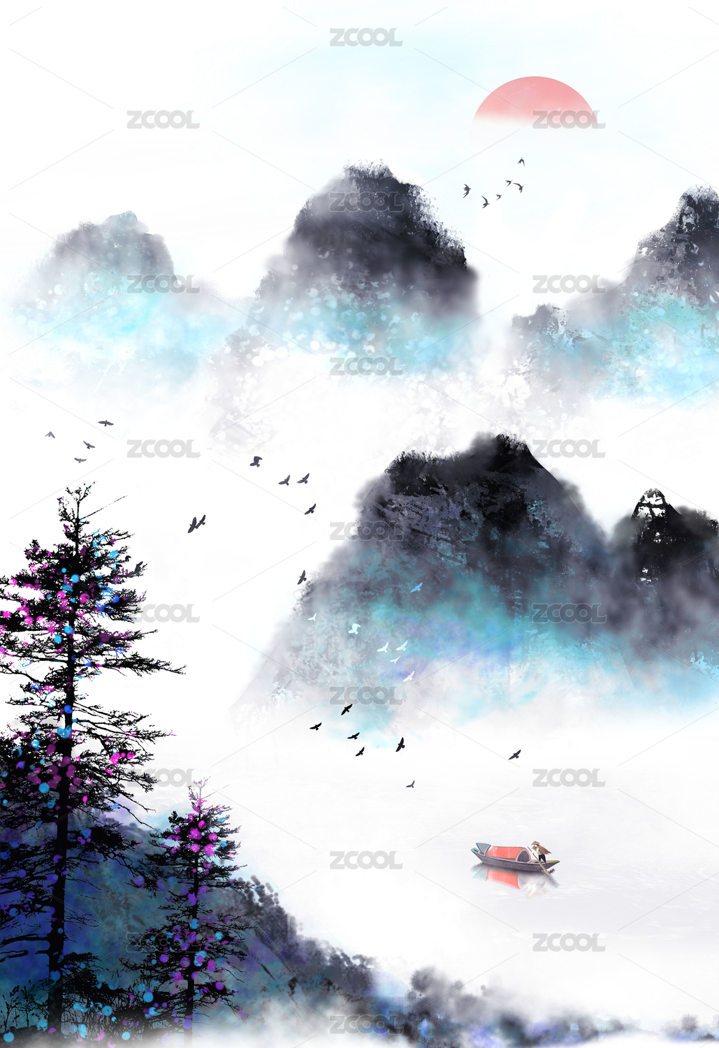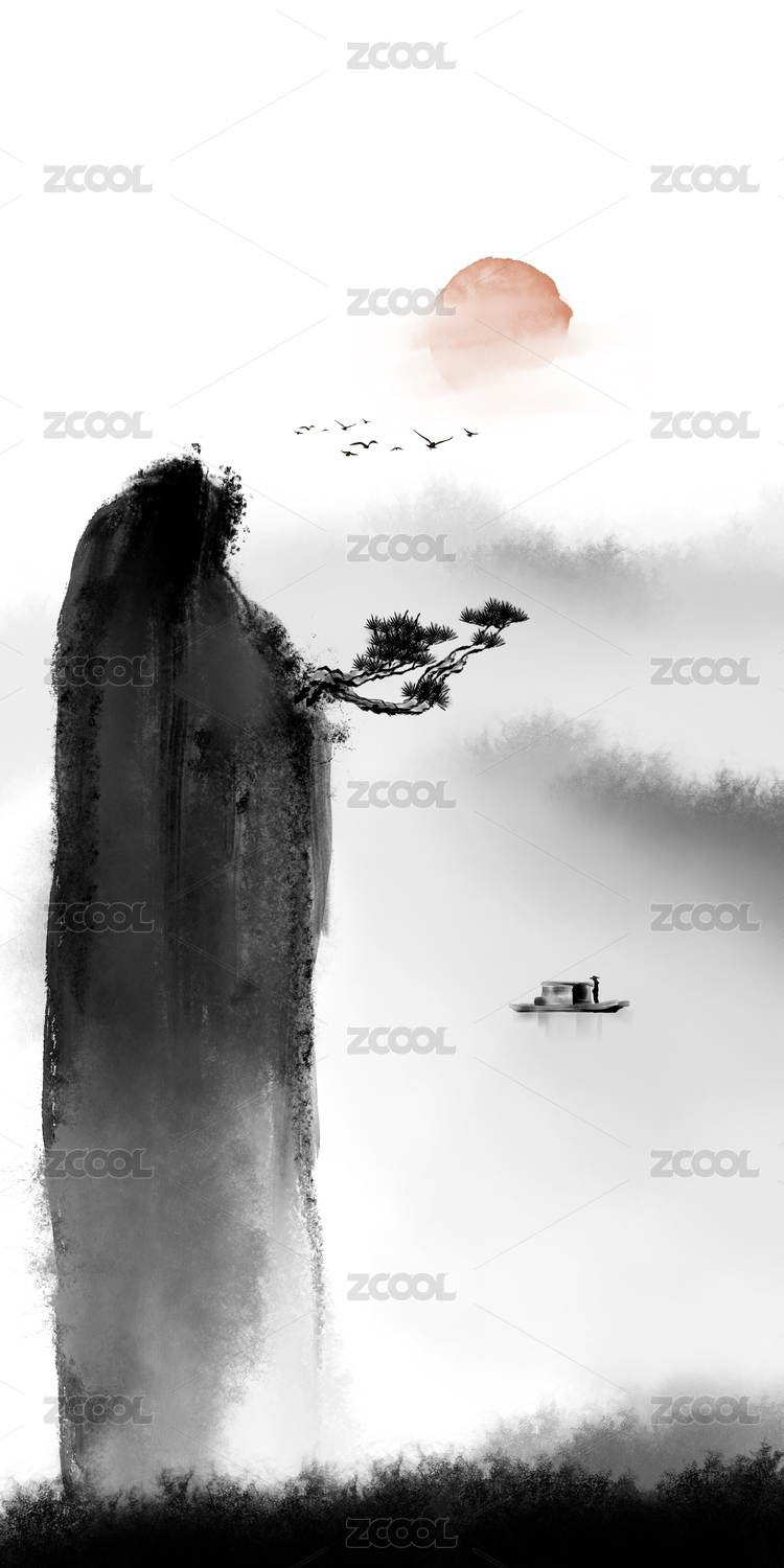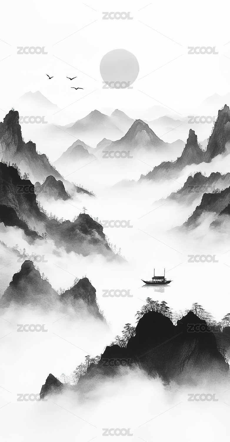中国风,水墨,山水,意境,写意,背景,抽象,绘画,太阳,渔船