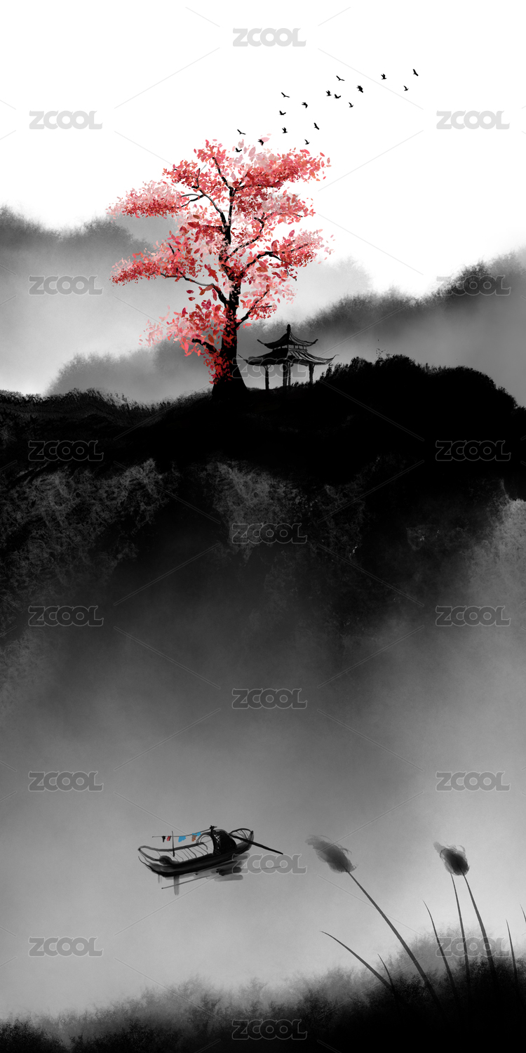竖版水墨山水