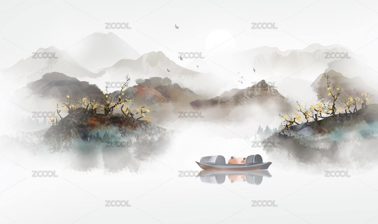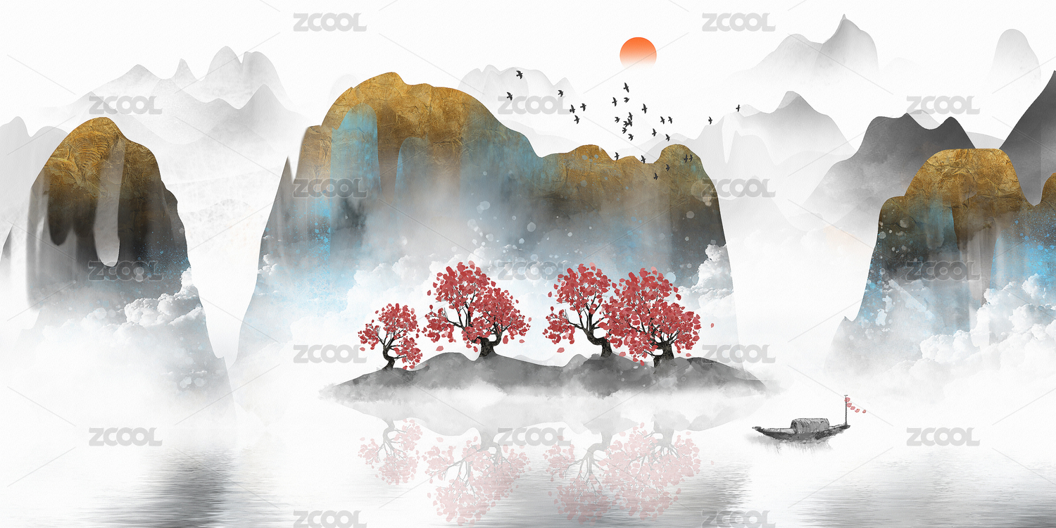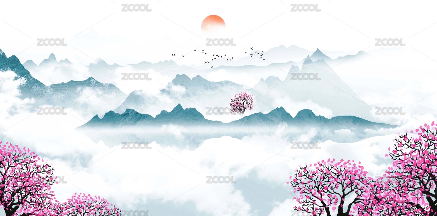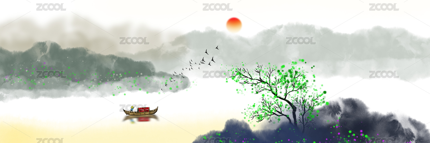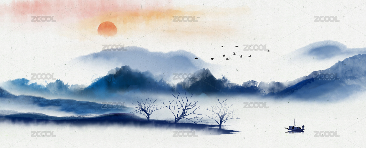 大气意境日出日落风光山水画水墨画