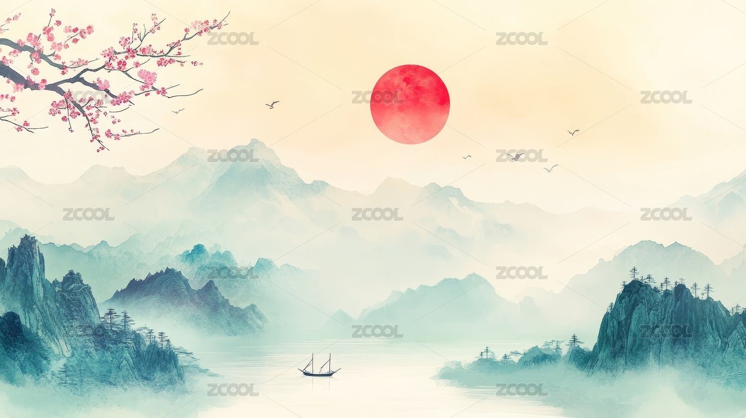 中国风水墨山水梅花背景图片