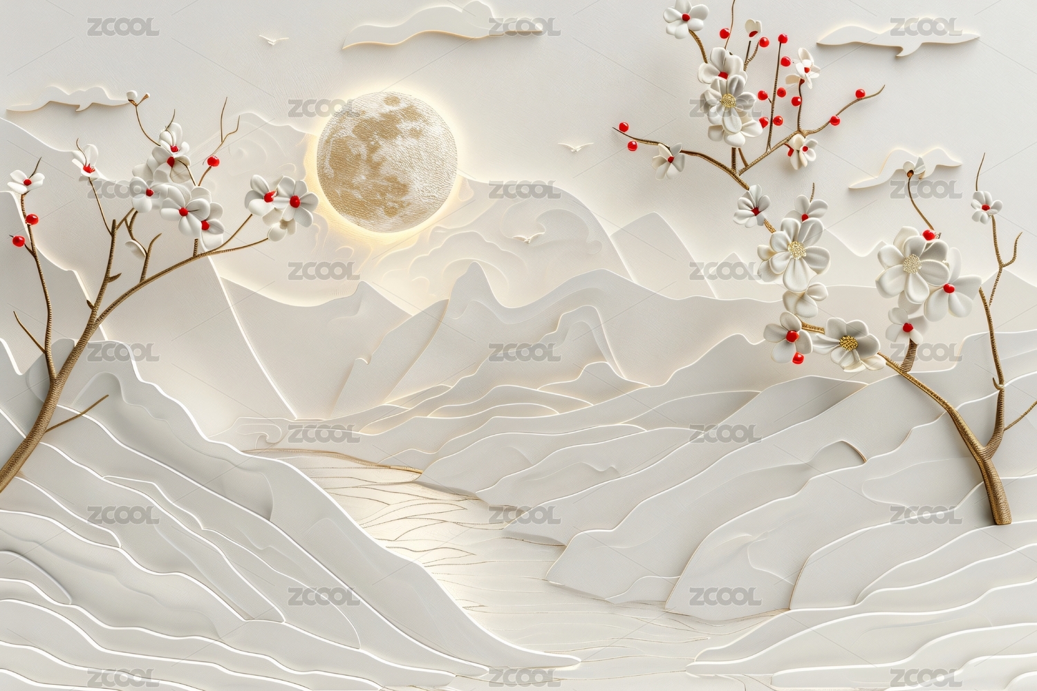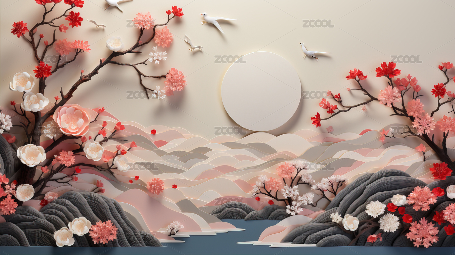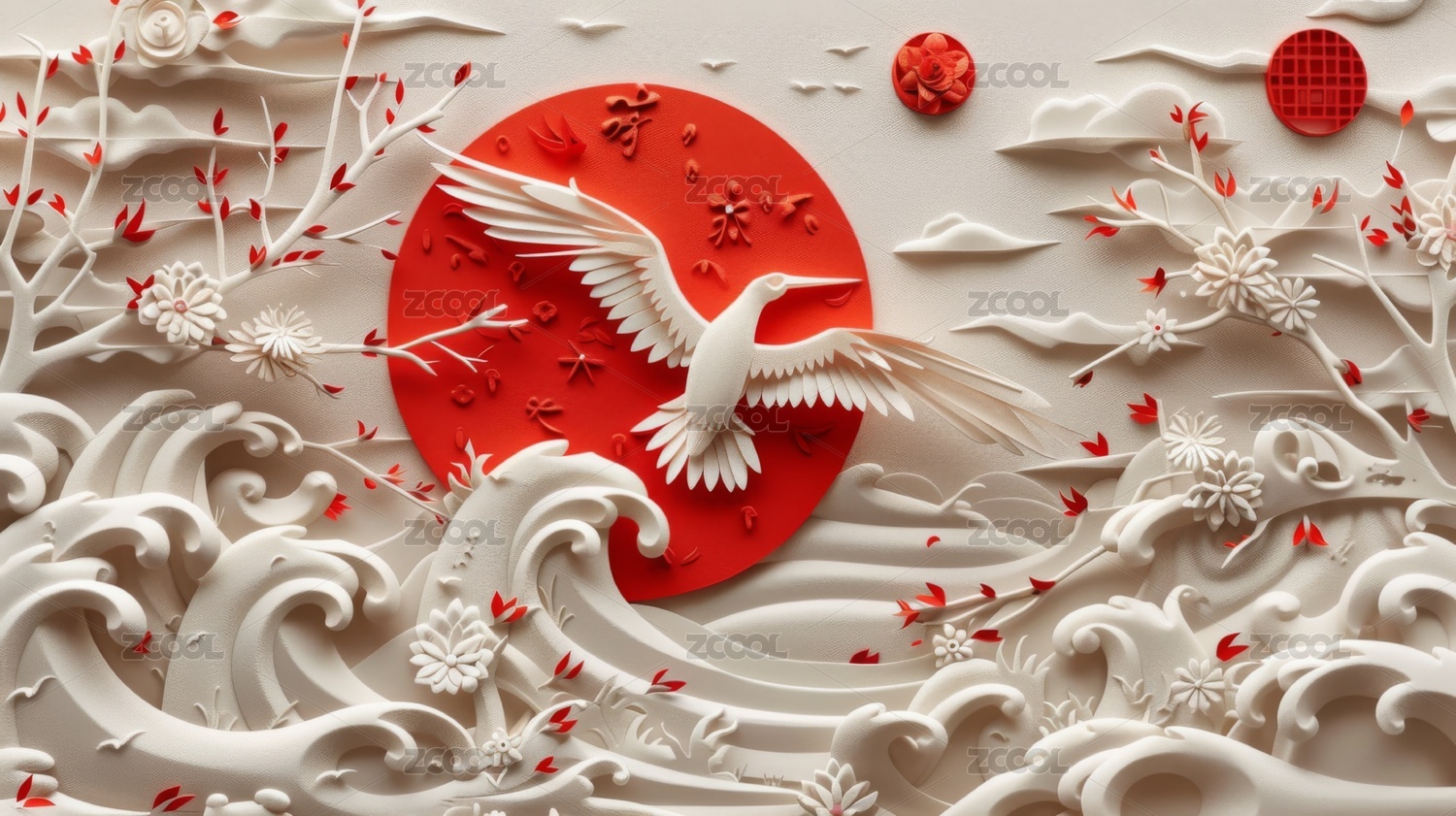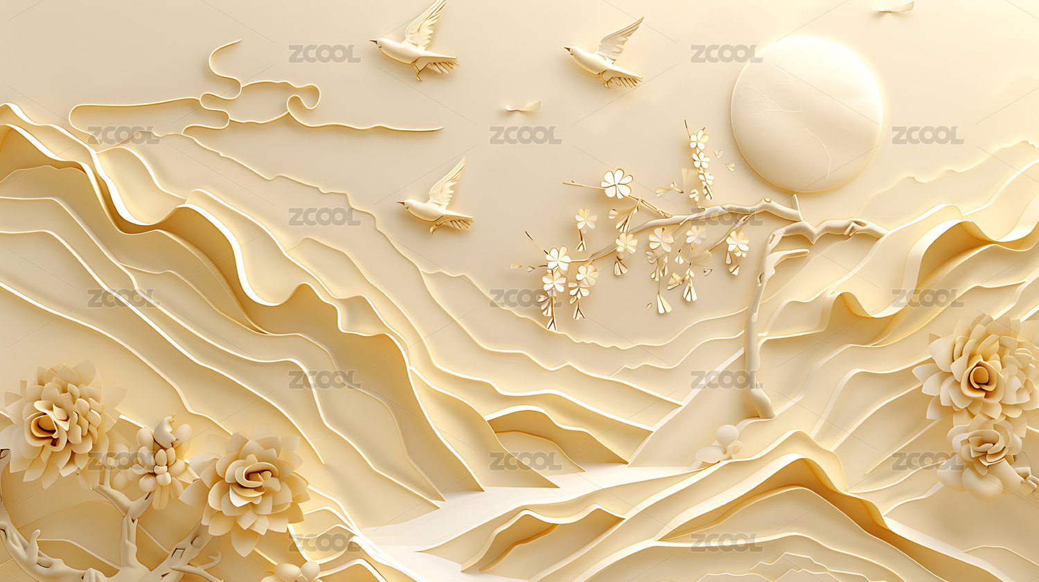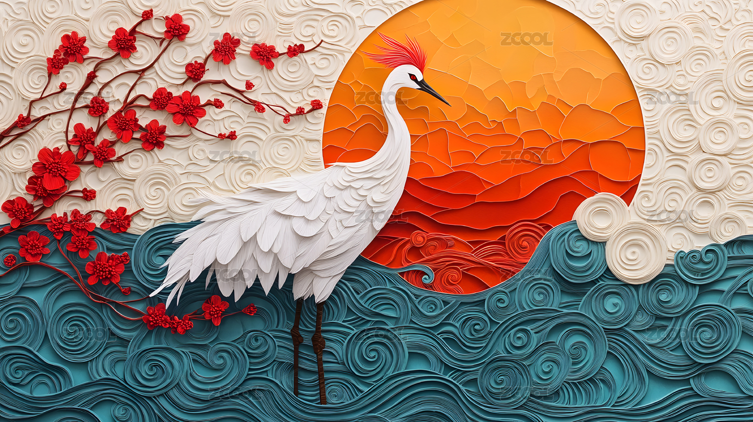 仙鹤,中式,金箔,楼阁,壁画,立体,浮雕,花鸟,雕花,栅格