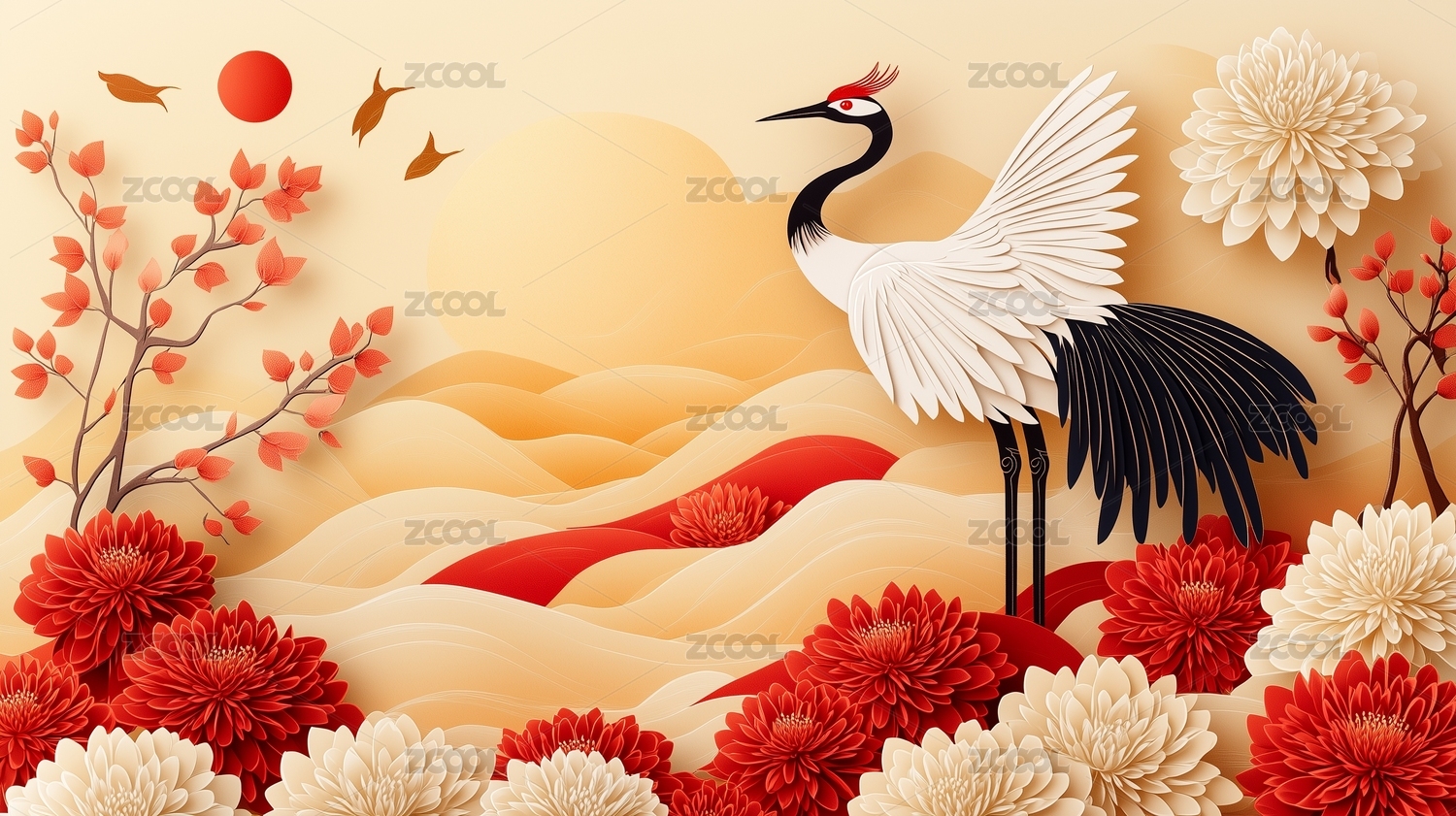 重阳节中国白鹤菊花夕阳风景氛围插画