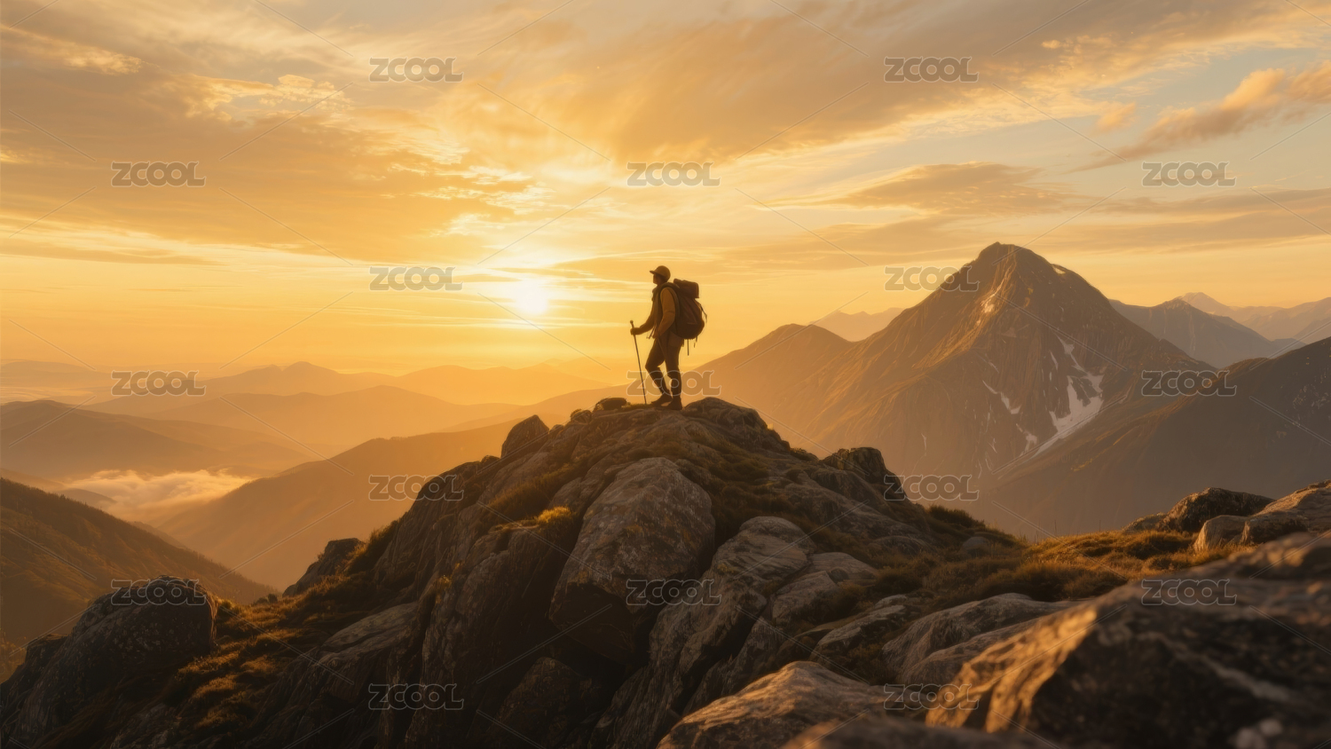 夕阳下站在雪山山顶的人