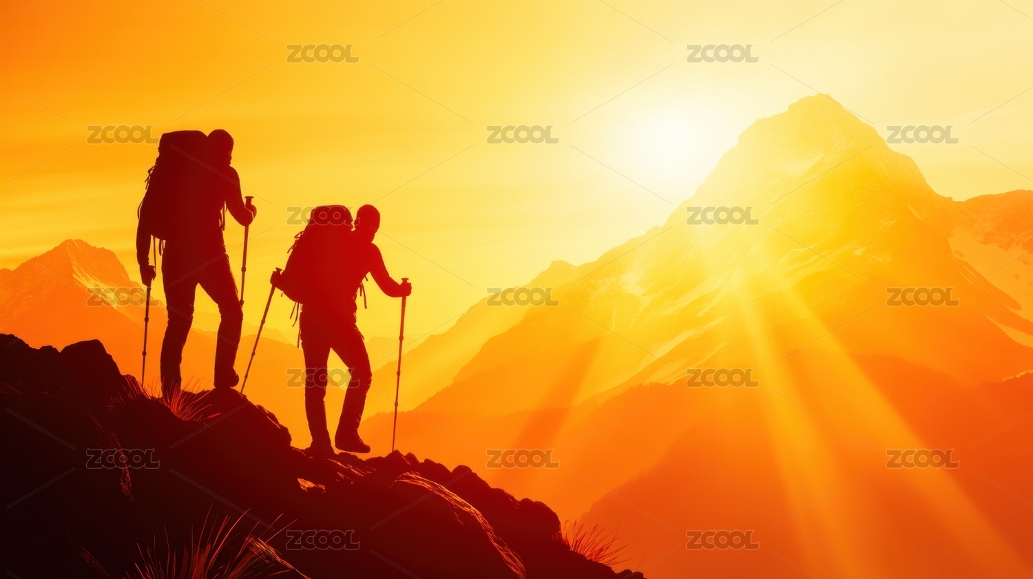 日落山峰上的登山者