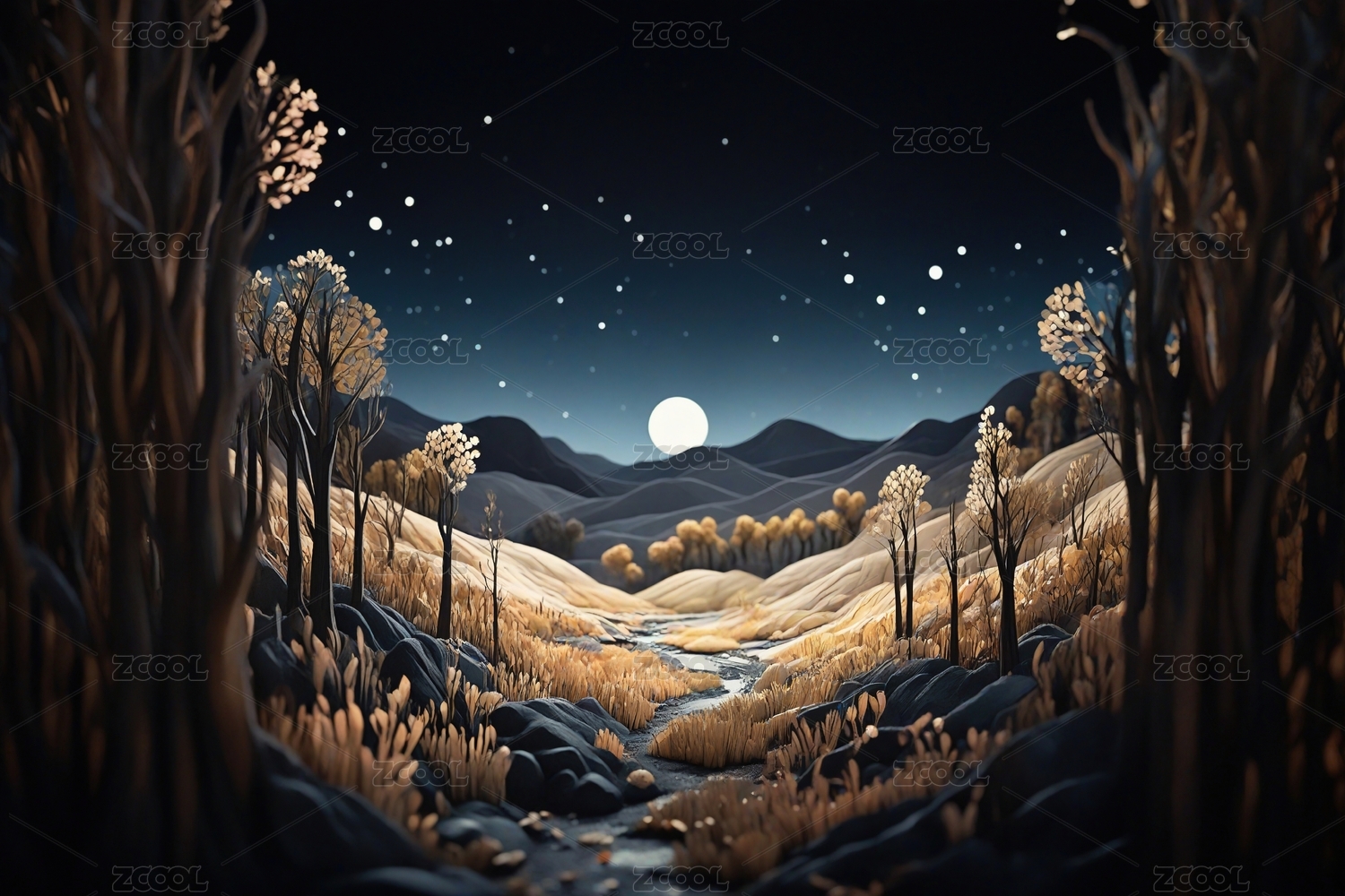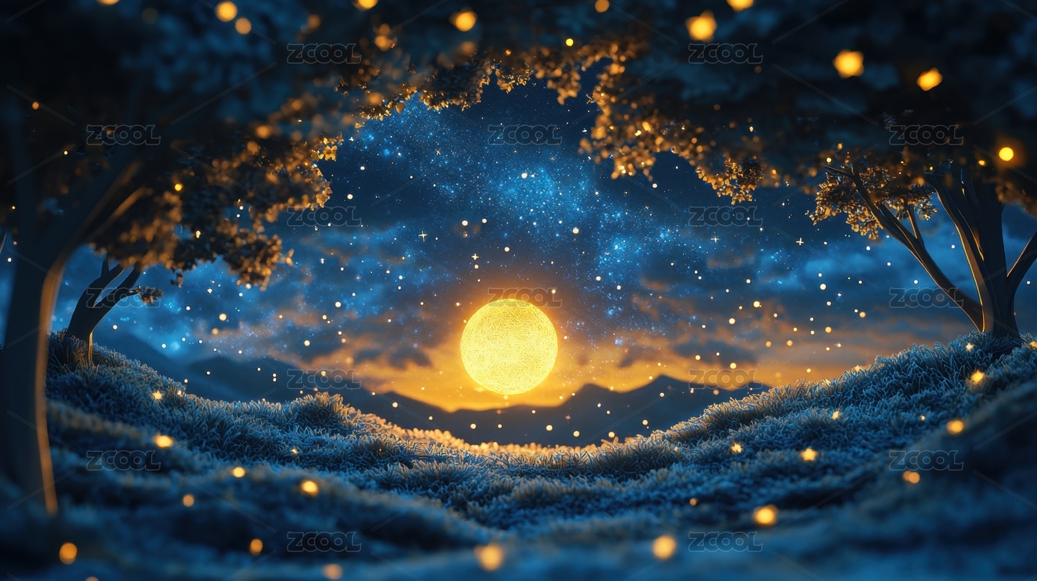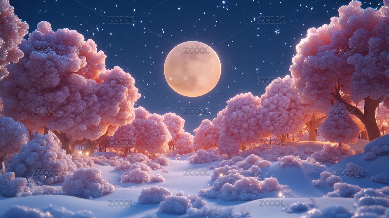 夜空,满月,树木,森林,云朵,雪地,星星,梦幻,自然