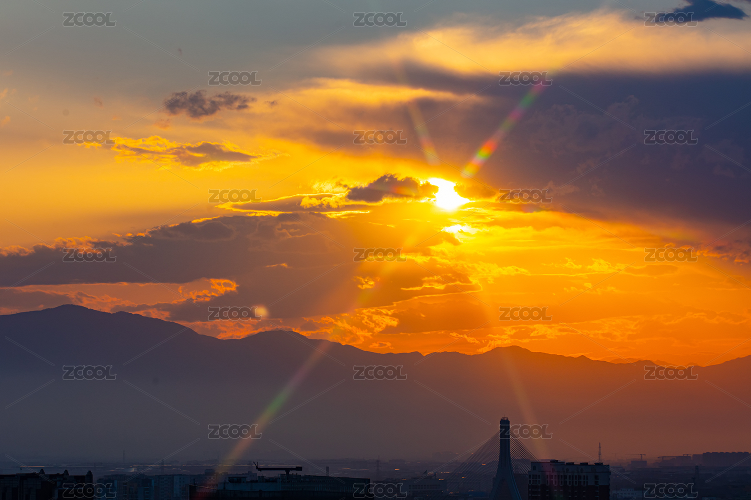 中国甘肃兰州市城市傍晚日落丁达尔光线风景