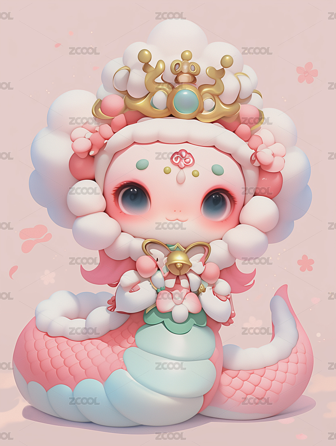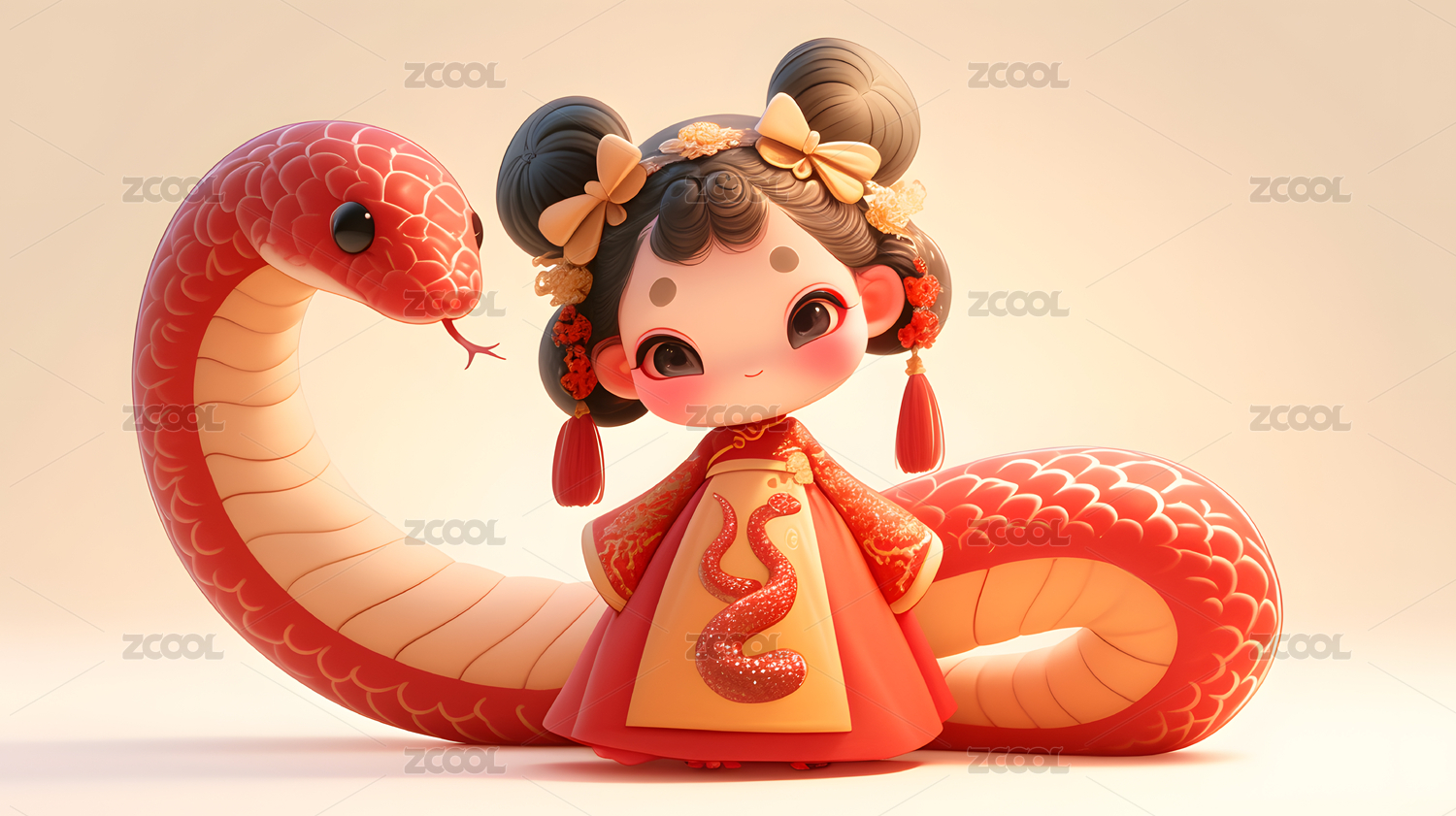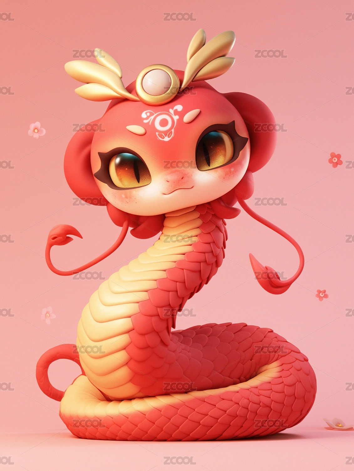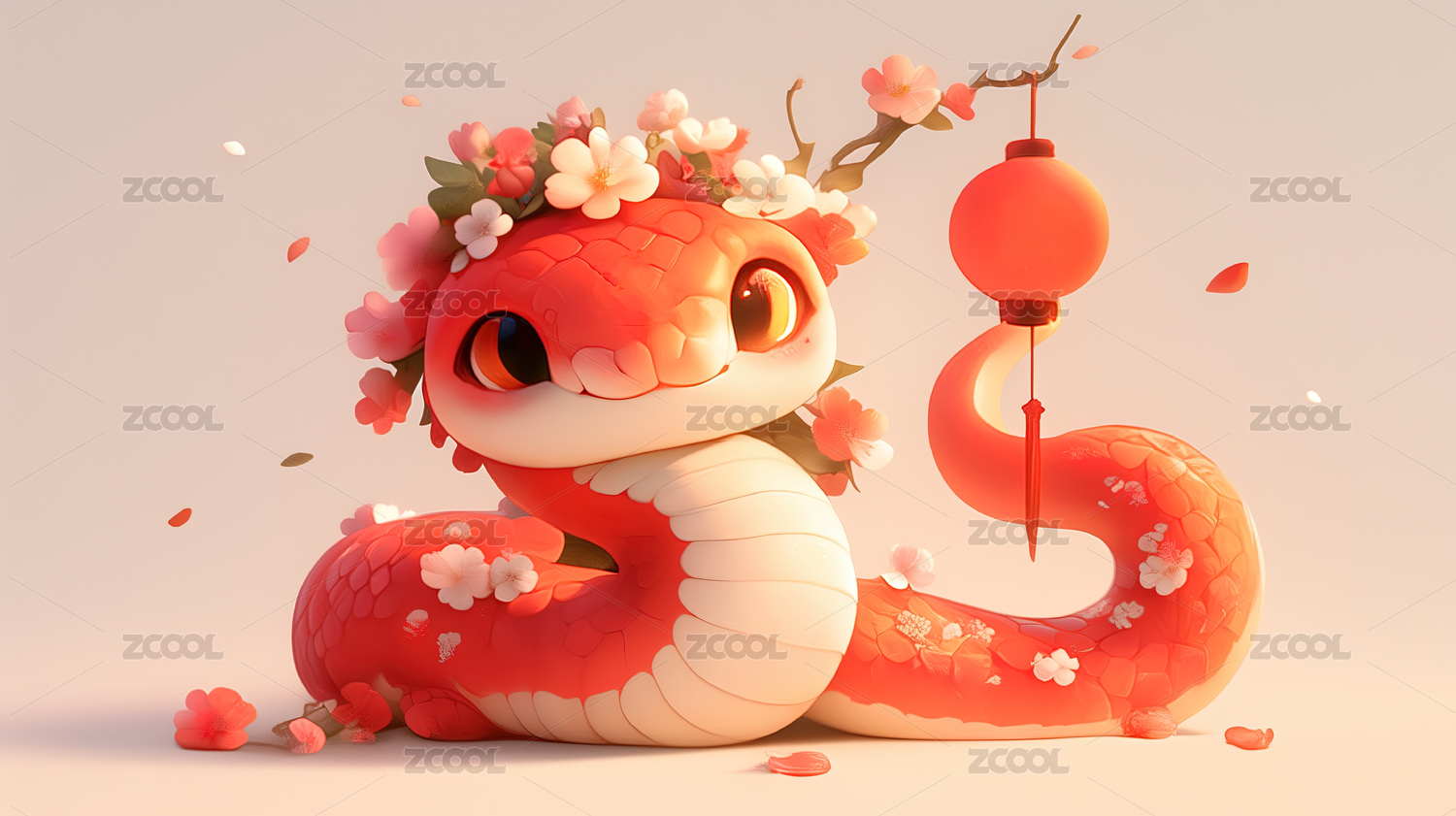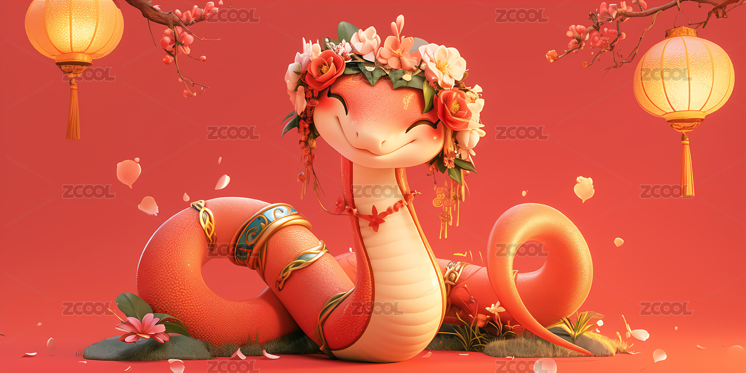 戴花环的3D卡通可爱小蛇蛇年背景插画