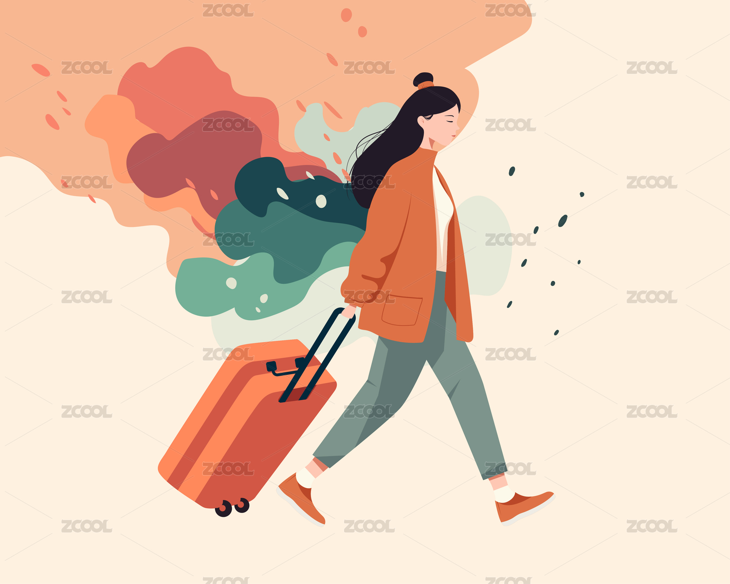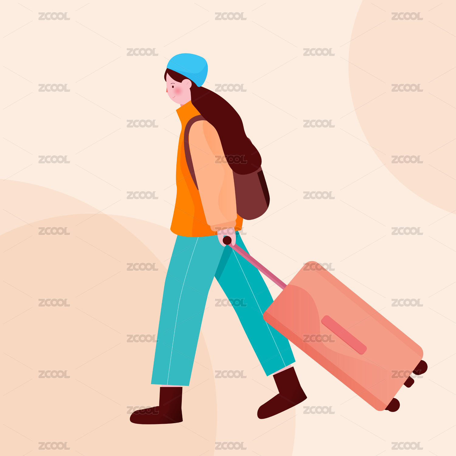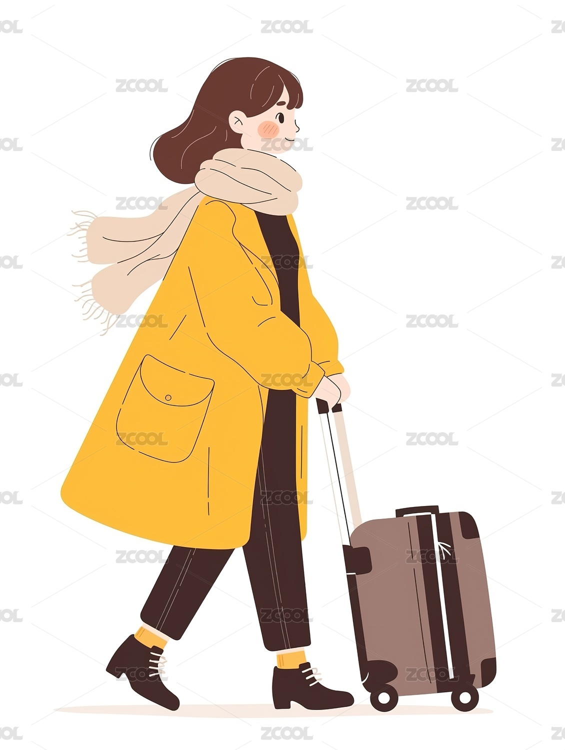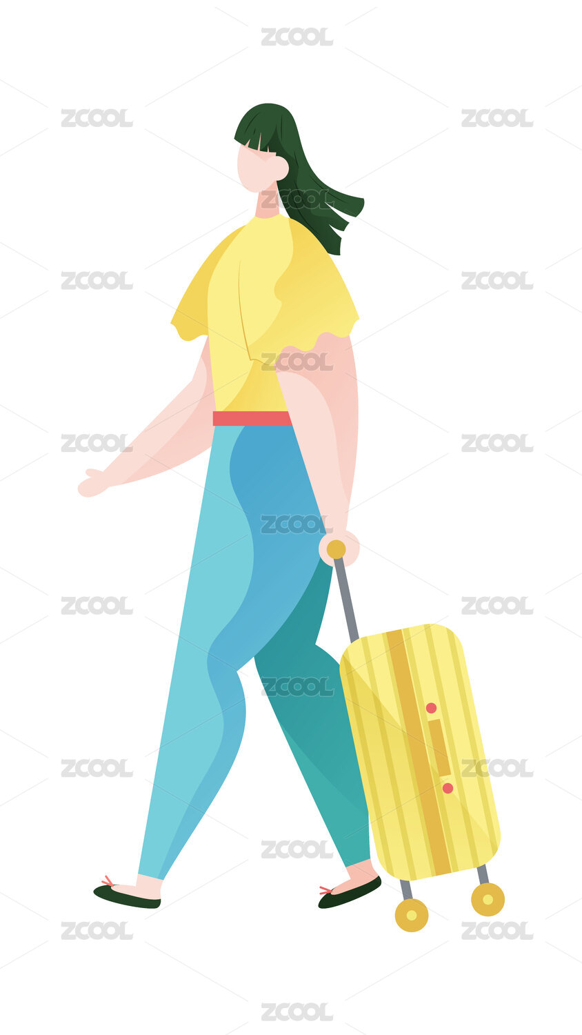 女孩拉着行李箱扁平插画