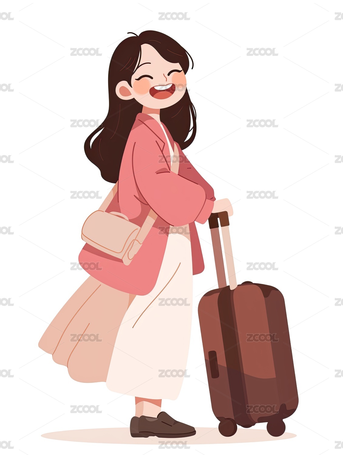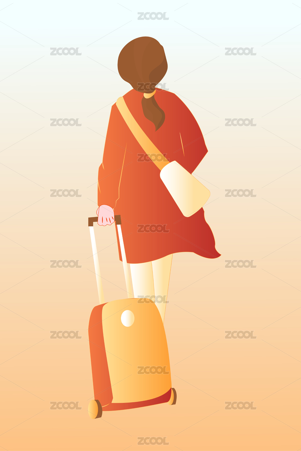 一个穿着旗袍扁平风美少女推着拉杆箱