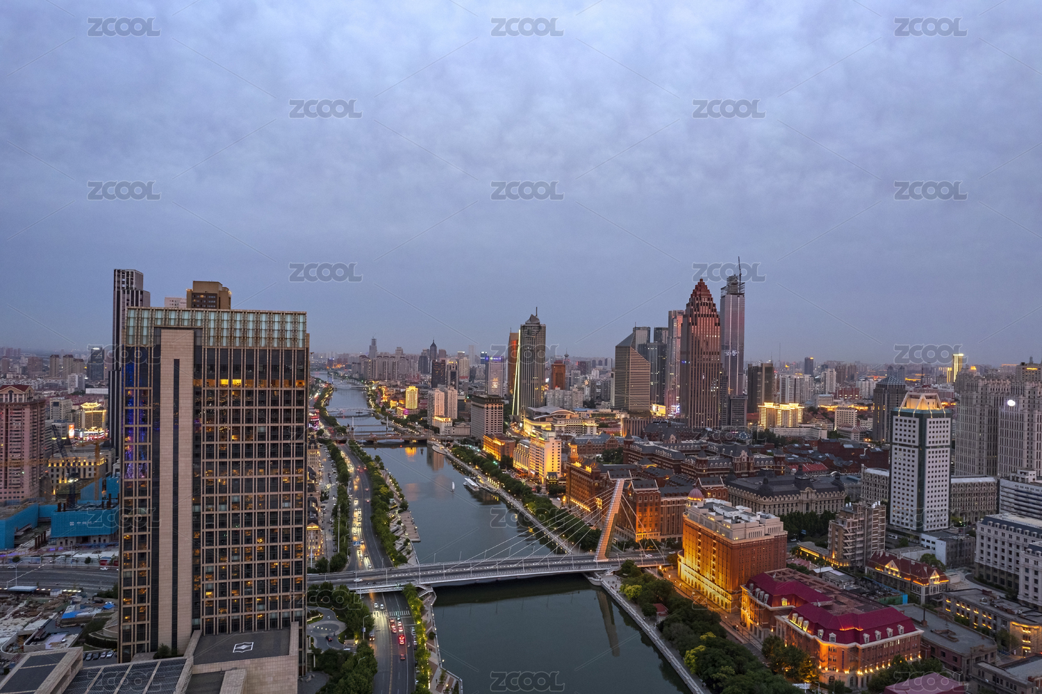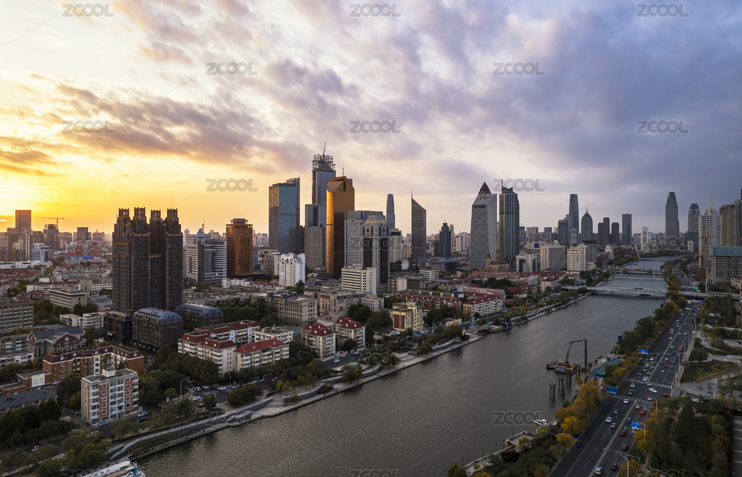 天津大光明桥海河沿岸城市建筑日落晚霞风光